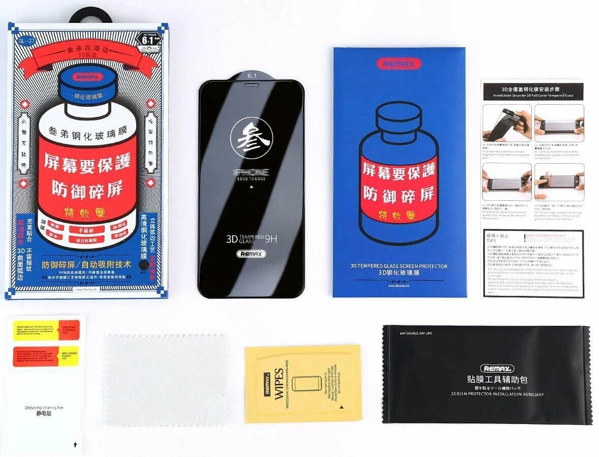 | Подробная комплектация | 1. Защитное стекло для iPhone Remax GL-27 2. Спиртовая салфетка 3. Салфетка из микрофибры 4. Стикеры для удаления пыли 5. Инструкция по наклеиванию 6. Надежная упаковка |
