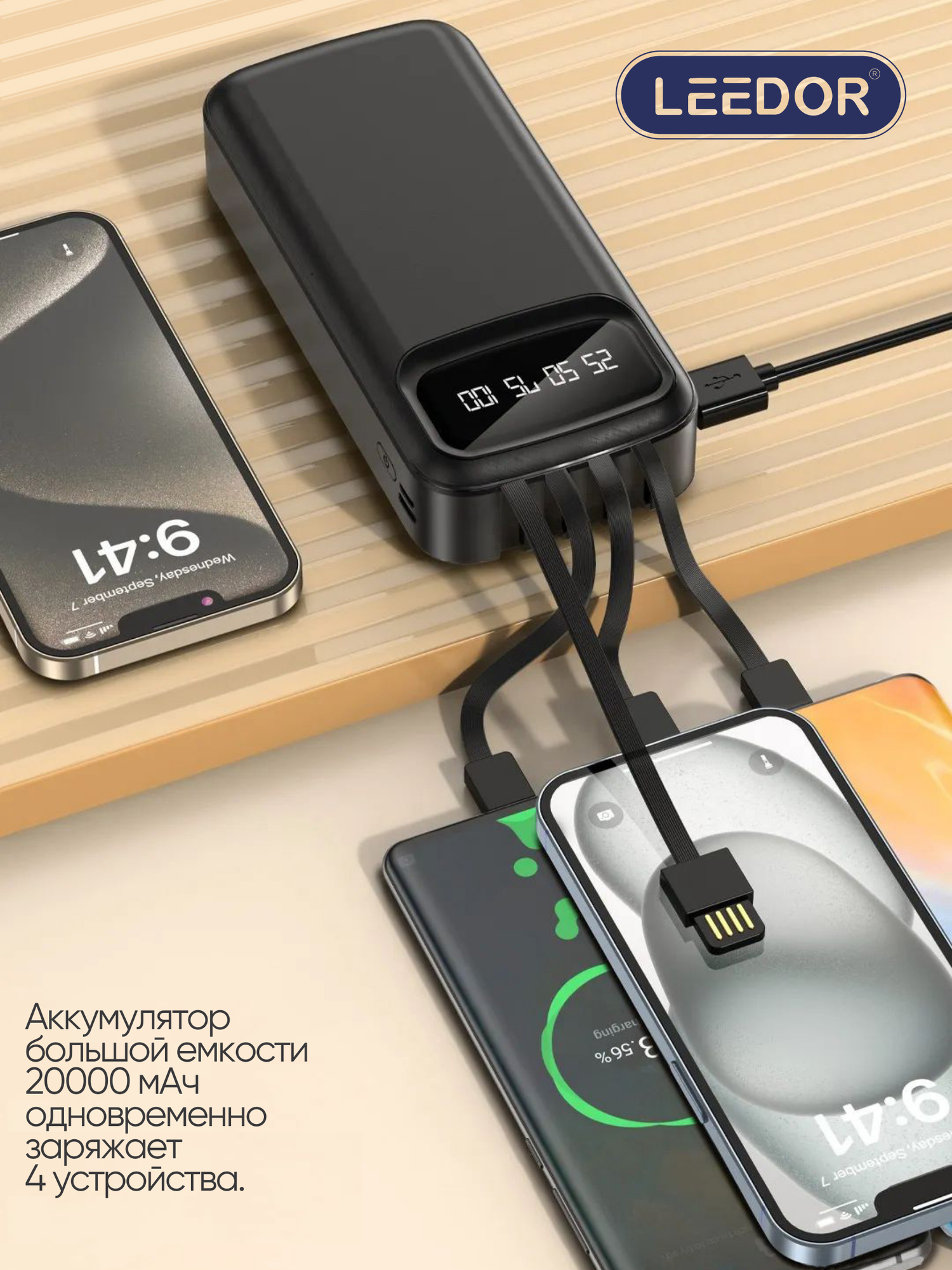 Повербанк Leedor с быстрой зарядкой и дисплеем 20,000 mAh, 4 кабеля, Черный информация: