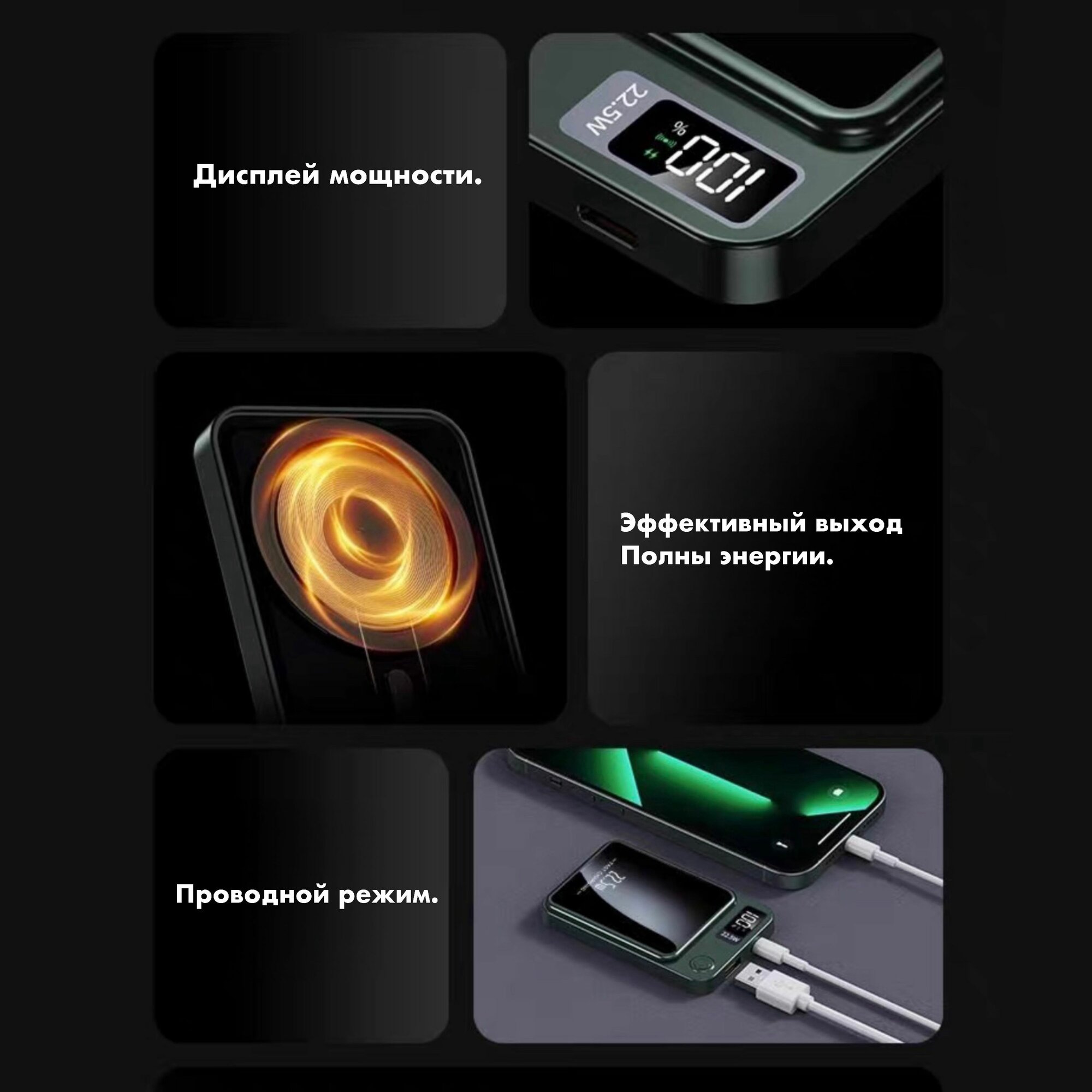 Внешний аккумулятор Power bank 10000 mAh 5V/3A/22.5W, с функцией беспроводной зарядки, с магнитным креплением и индикатором заряда. цвет зеленый 3 599 ₽