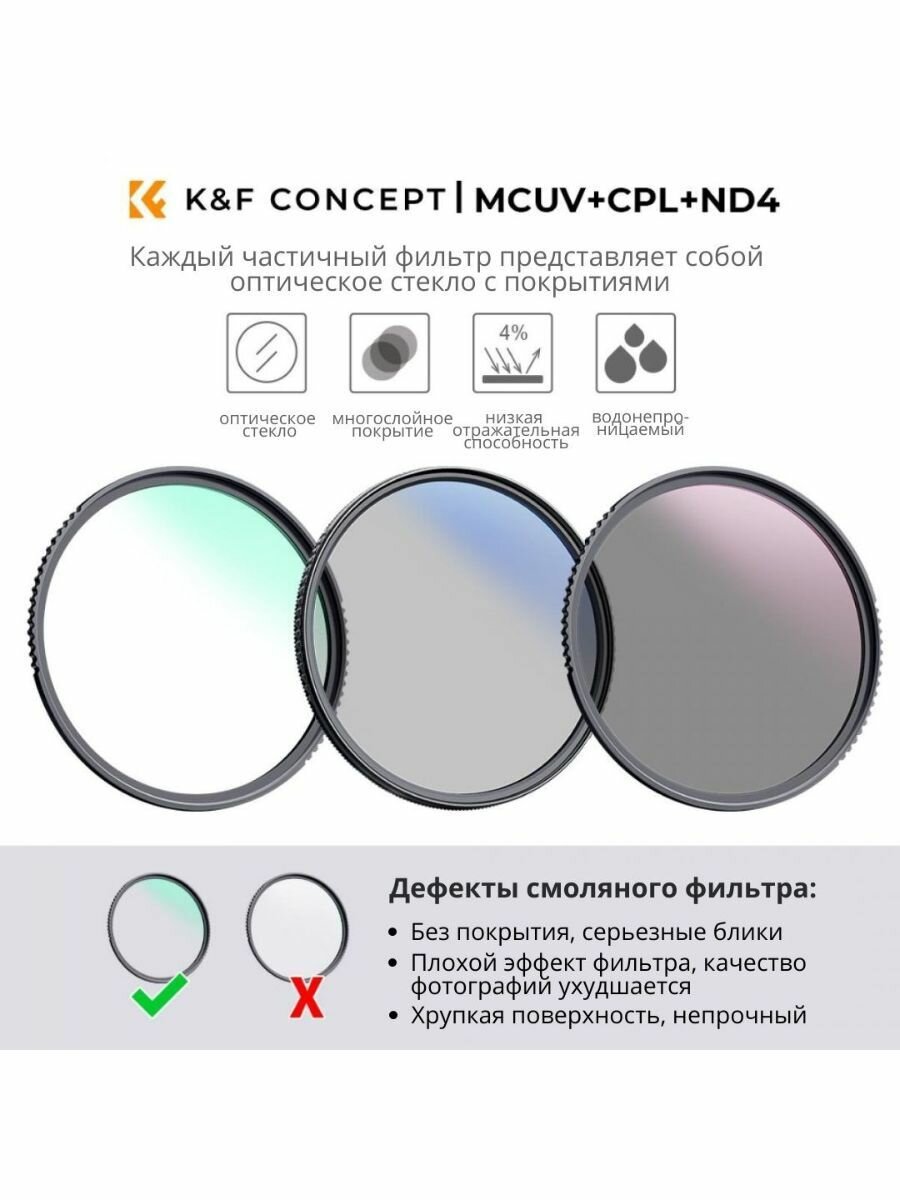 Отзывы на Набор из 3 фильтров K&F Concept (MCUV/CPL/ND4) + Filter Pouch, 77mm