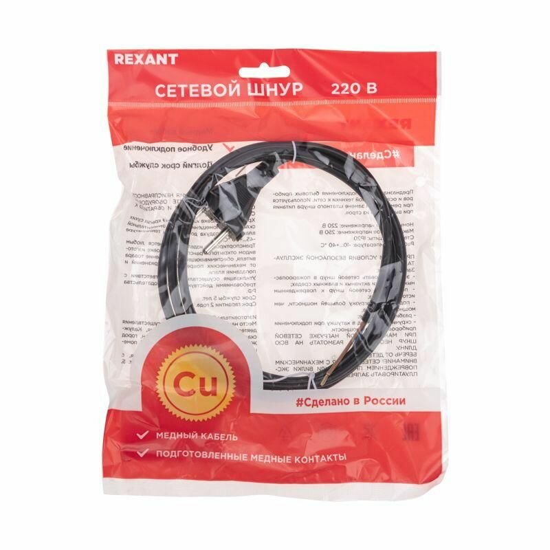 Шнур электрический с прямой вилкой 10А 2200Вт ПВС 2х0.75кв.мм 2м черн. Rexant 11-1307 информация: