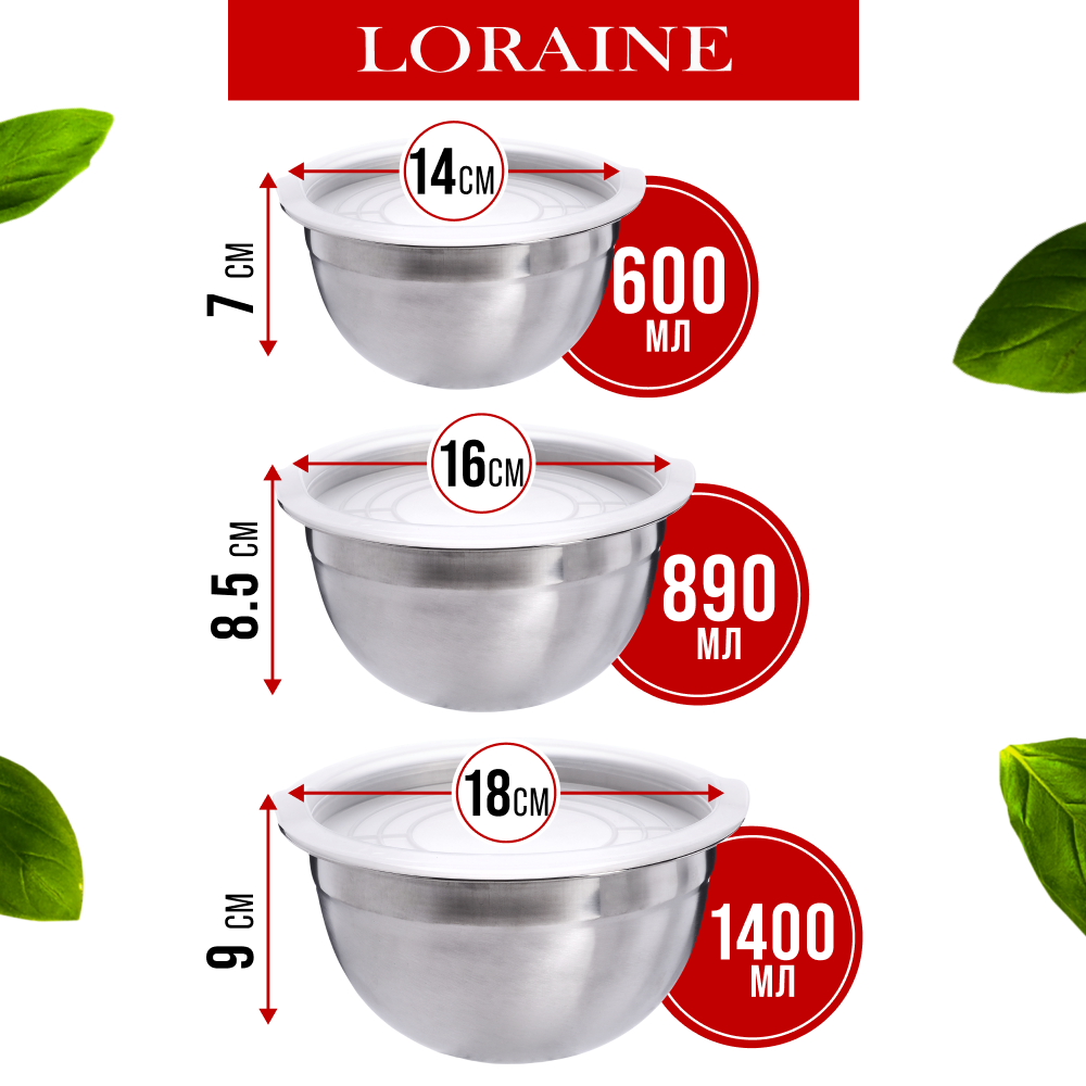 | Комплектация | 3 миски с крышками: объем 0,4 мл./0,890 мл./1,4 л. диаметр 14/16/18 см, диаметр дна 6/7/7,5 см, высота 7/8,5/9 см |