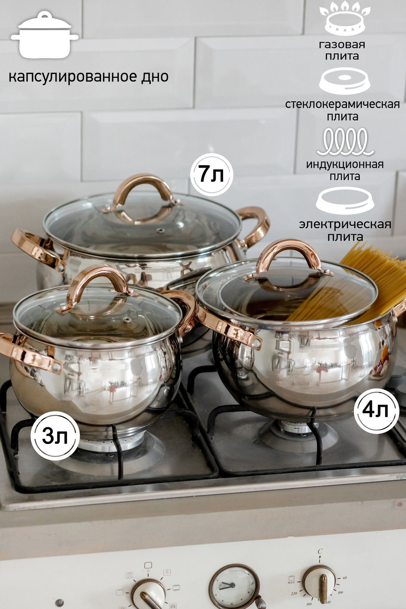 | Подробная комплектация | коробка, крышка - 3 шт., инструкция, кастрюли 3 л, 4 л, 7 л |