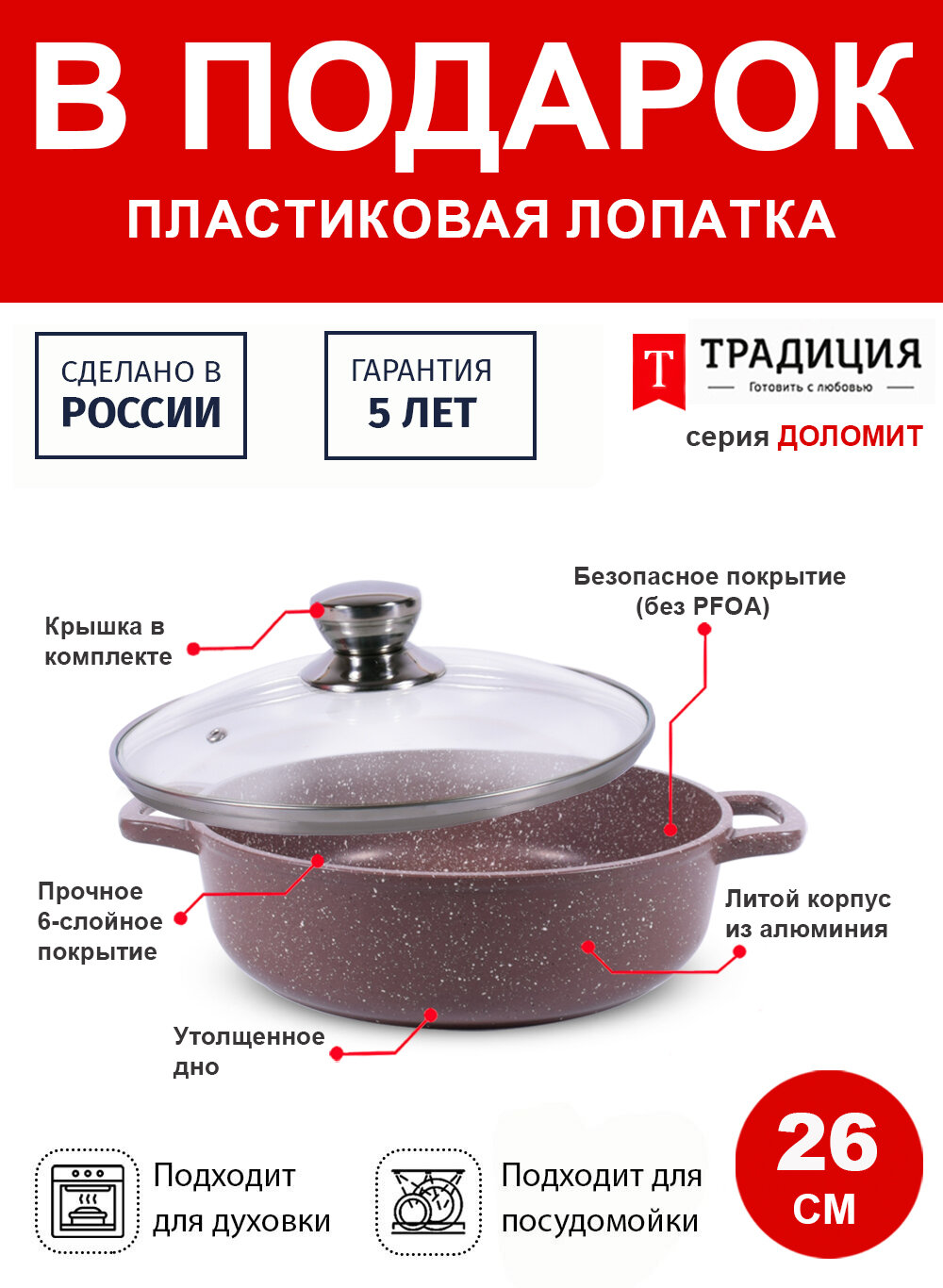 10 цен на Сотейник жаровня с крышкой 3л/26см ТМ традиция Доломит с каменным покрытием, Россия + Лопатка в подарок