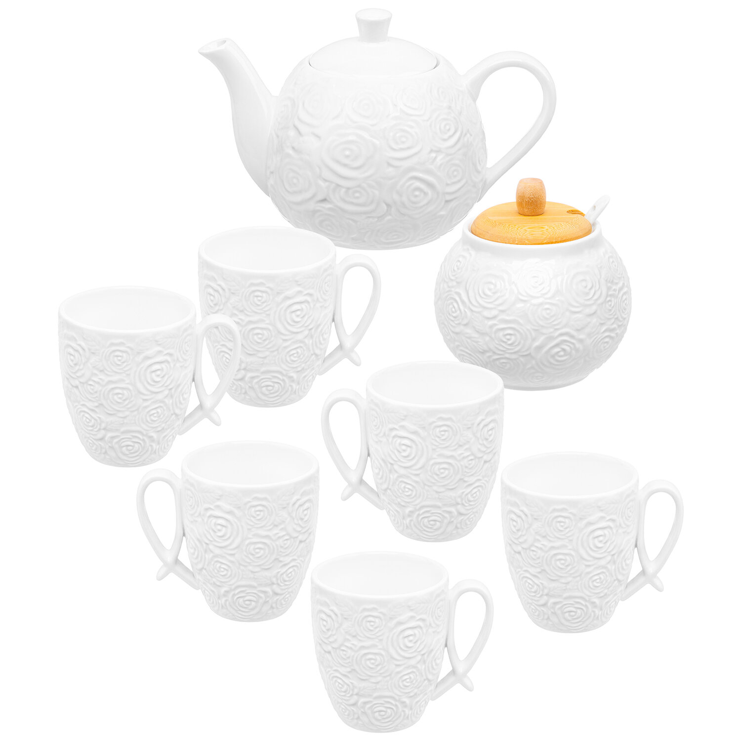 Отзывы на Чайный набор чайник 900 мл, сахарница 620 мл, 6 кружек по 300 мл Elan Gallery Розы, на бамбуковой подставке