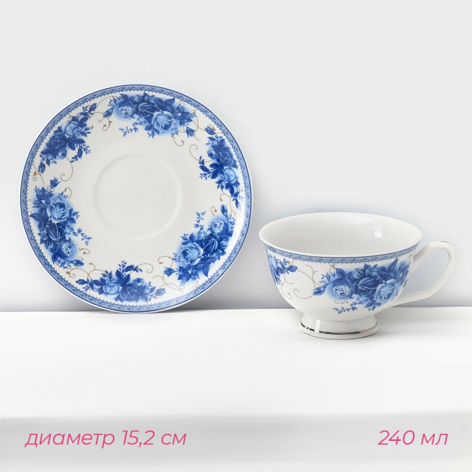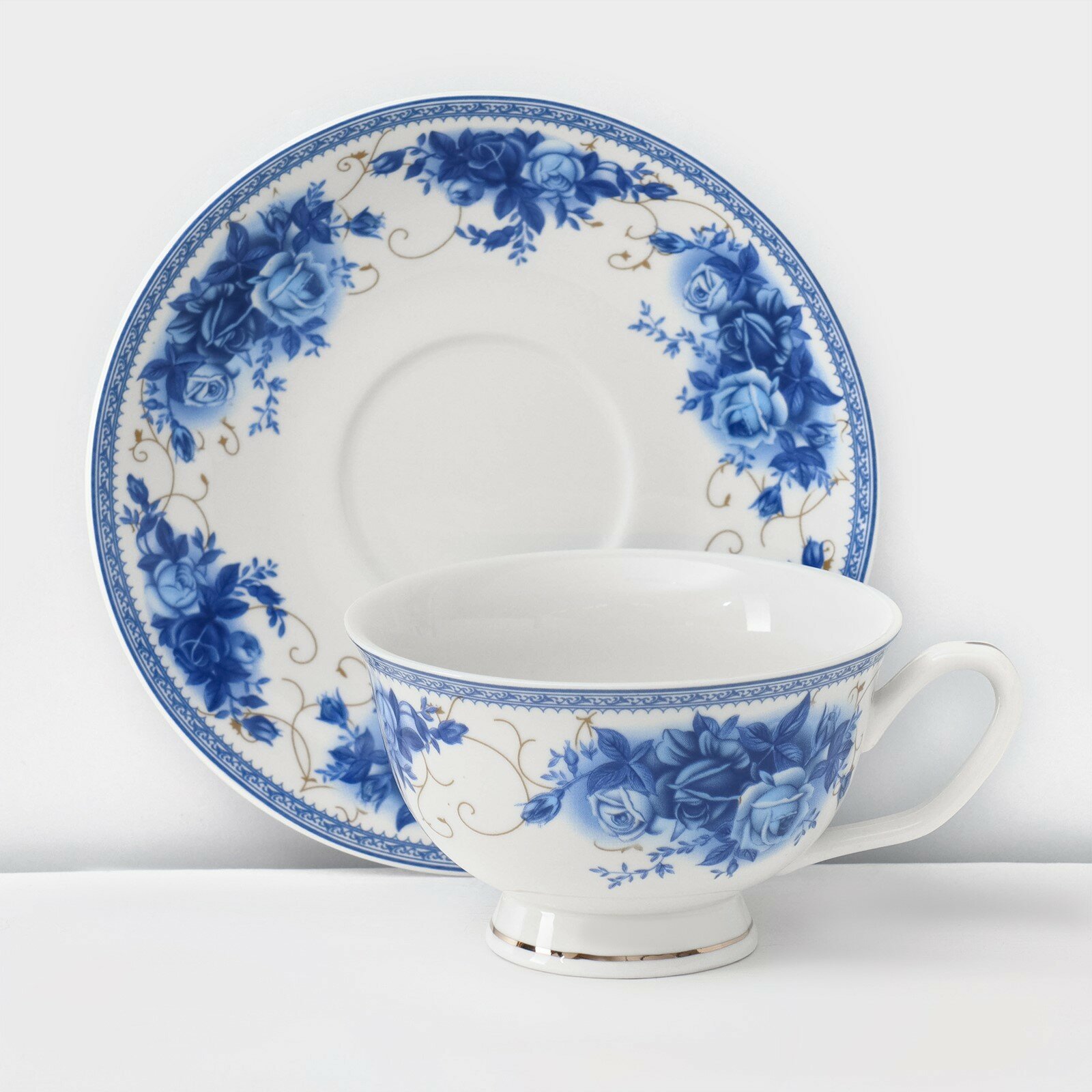 Чайная пара фарфоровая Доляна «Вивьен»: чашка 200 мл, блюдце d=15 см, цвет голубой 590 ₽