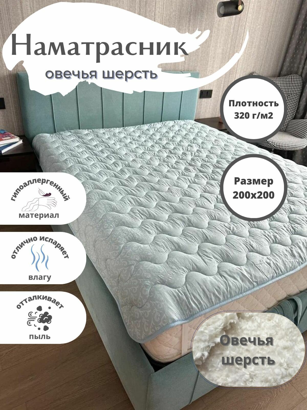 Наматрасник из овечьей шерсти 200х200 см информация: