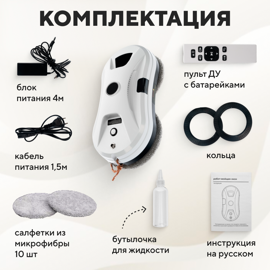 | В комплекте | зарядное устройство, моющая тряпка, пульт ДУ, страховочный шнур, фиксирующее кольцо |