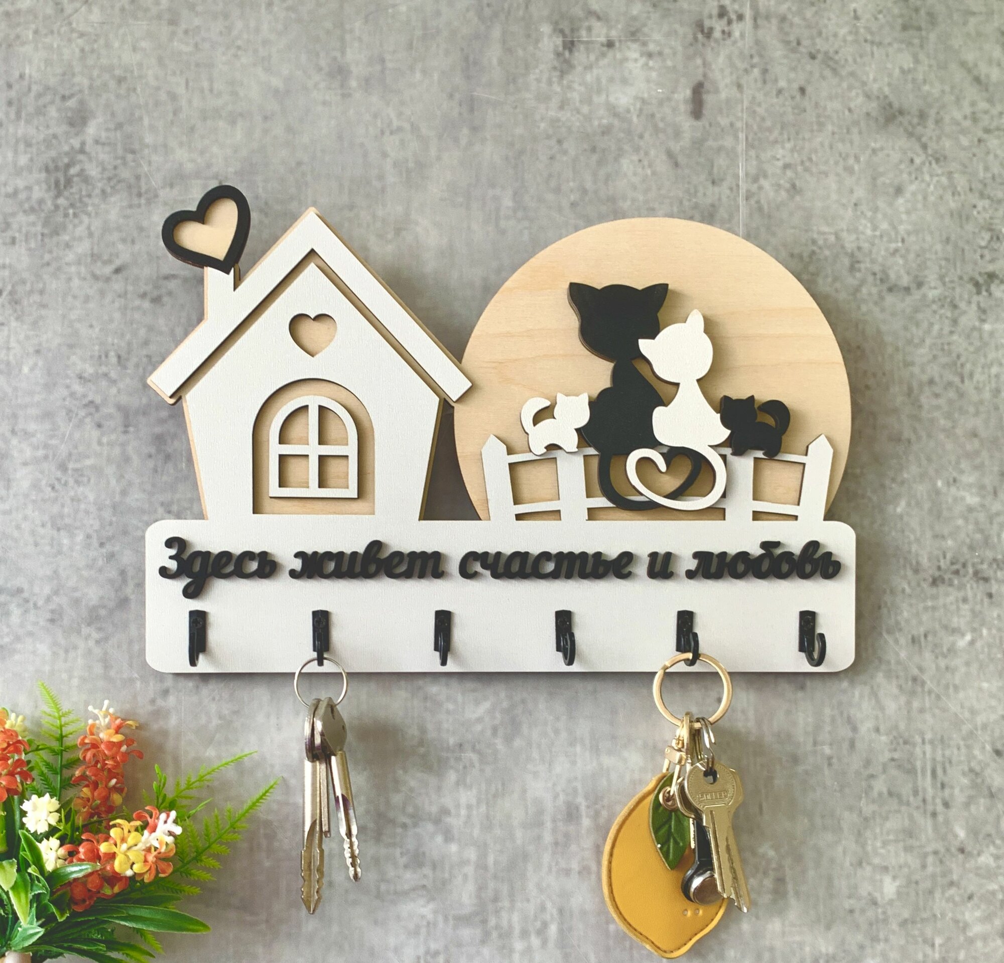 Ключница настенная именная с фамилией "Дом Семьи Ляховых" в дом с котом и собакой в прихожую в подарок на нвооселье