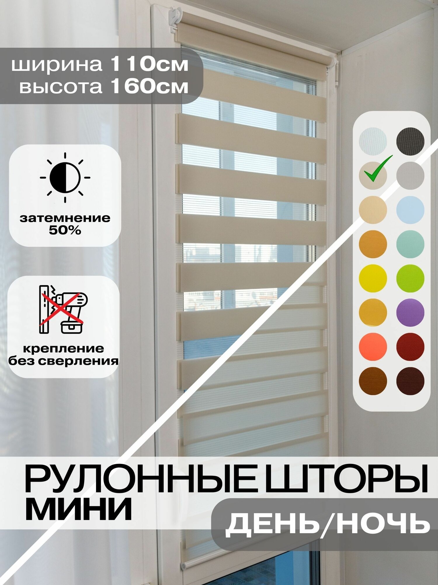 Рулонные шторы день ночь ширина 110см, высота 160 см бежевые жалюзи на окна Зебра для кухни, спальни, детской, на балкон информация: