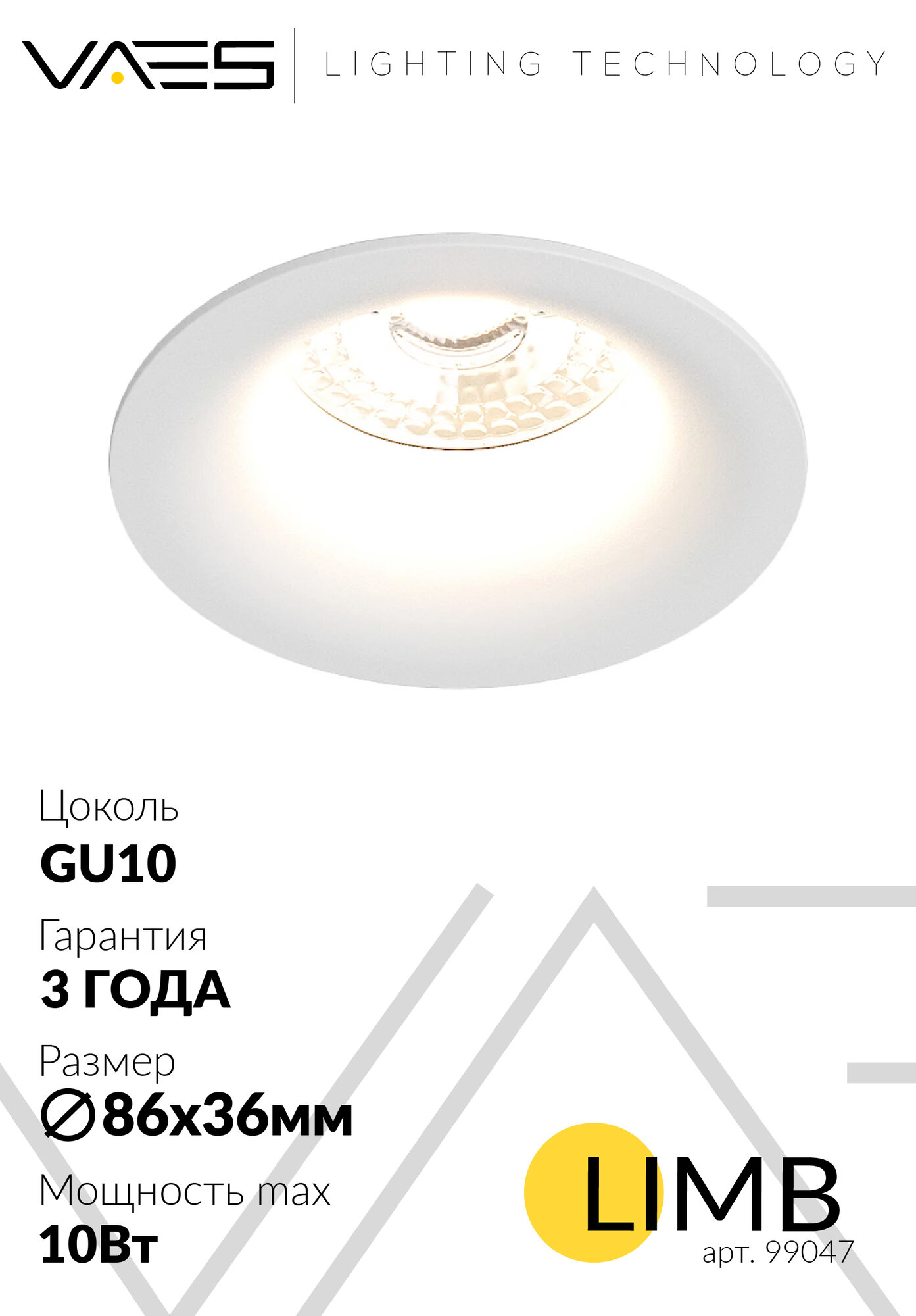 | Комплектация | Встраиваемый точечный светильник LIMB -1шт, Цоколь GU10 - 1шт |
