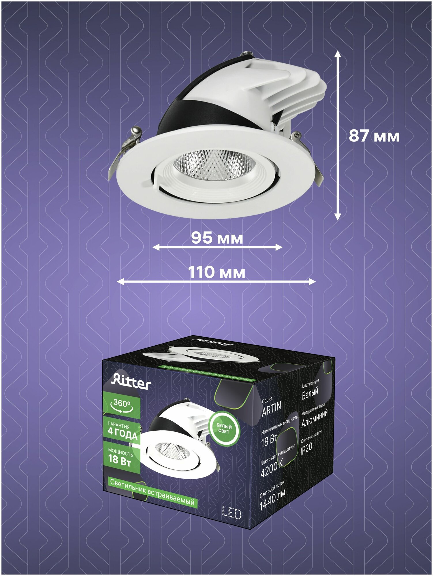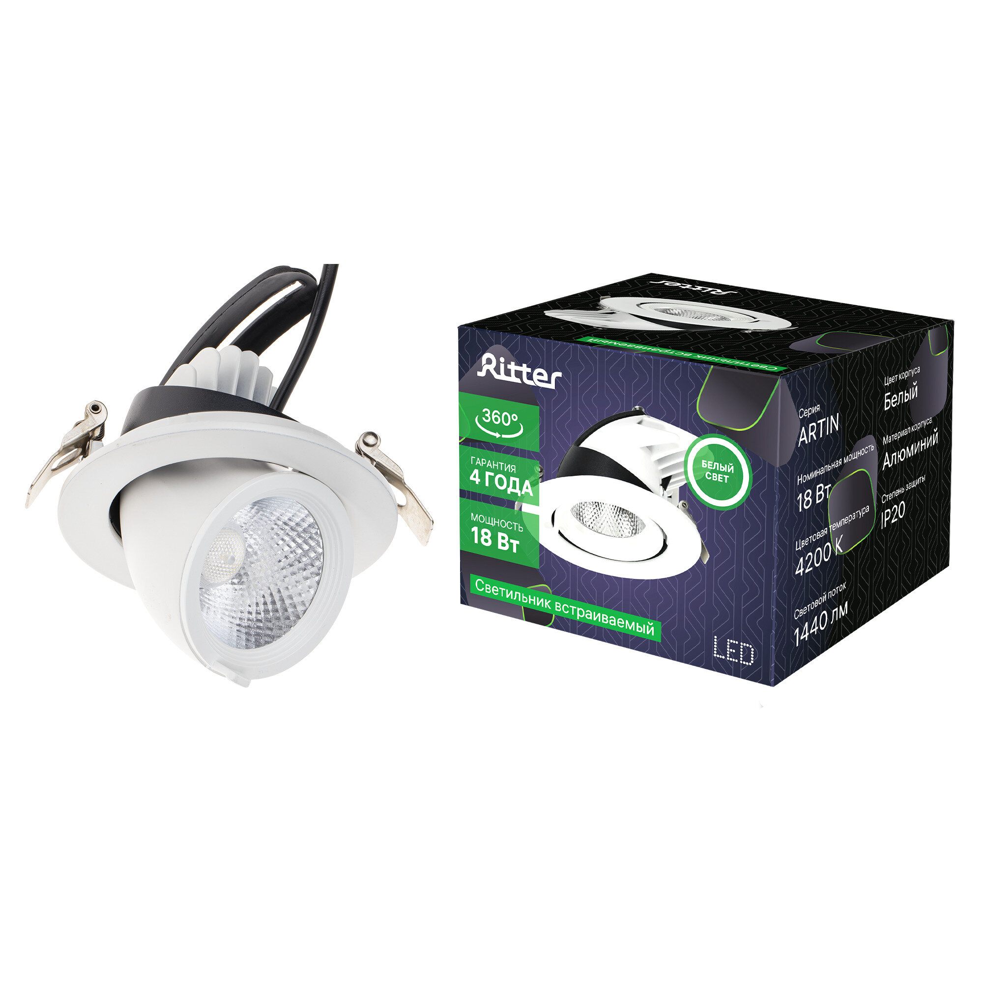 Отзывы на Светильник светодиодный встраиваемый потолочный Artin LED, 18Вт, 1440Лм, 4200К, 110х87мм, выдвижной поворотный корпус, алюминий, белый, Ritter 59995 1