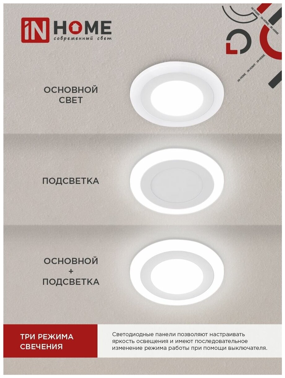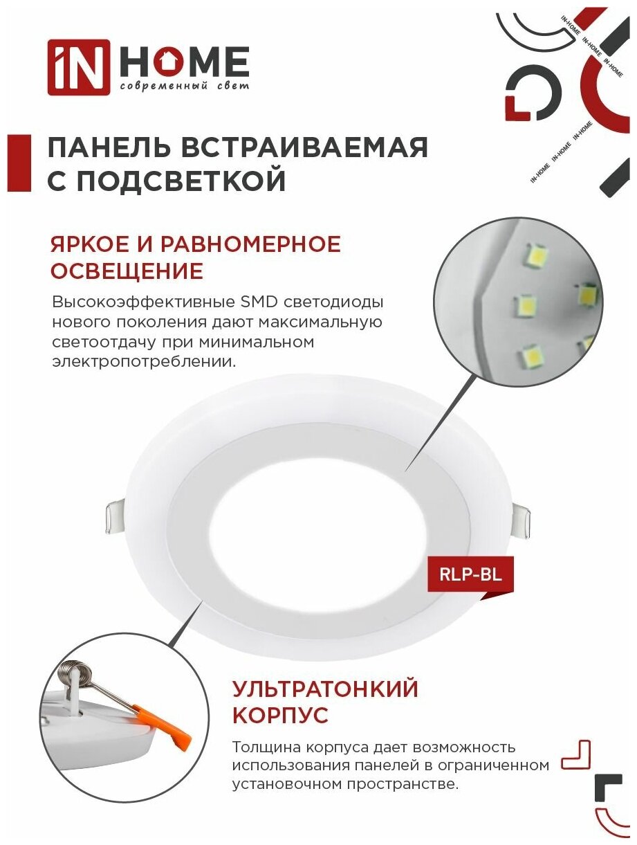 IN HOME Панель сд встраиваемая круглая RLP-BL 9Вт 230В 4000К 540Лм 145мм с подсветкой белая IP20 (арт. 4690612032962) 509 ₽
