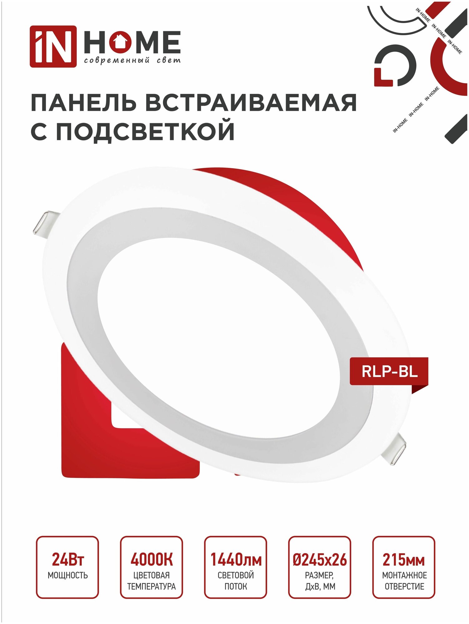 | Дополнительная информация | Светильник светодиодный встраиваемый круглый RLP-BL 24Вт 230В 4000К 1440Лм 245мм с подсветкой белый IP20 IN HOME |