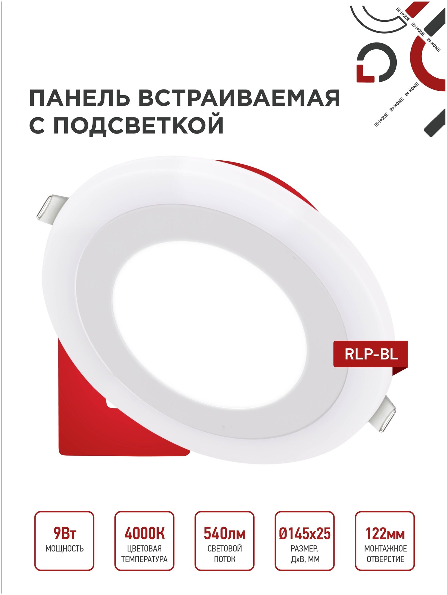 IN HOME Панель сд встраиваемая круглая RLP-BL 9Вт 230В 4000К 540Лм 145мм с подсветкой белая IP20 (арт. 4690612032962) 509 ₽