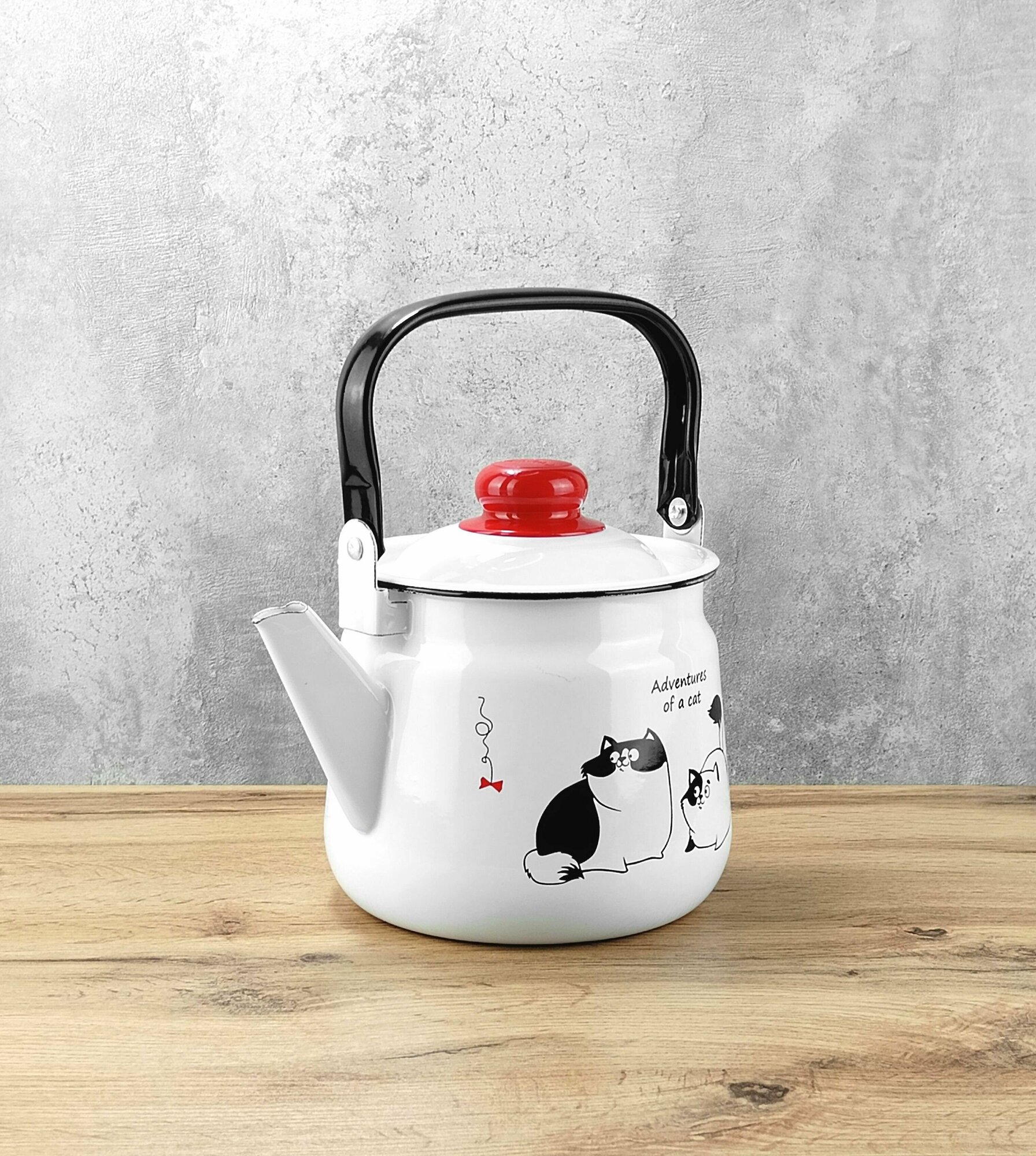 Чайник эмалированный 2,5 л Белый с рисунком "Коты" информация: