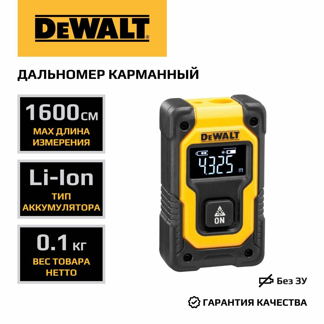 Аккумуляторный лазерный дальномер DEWALT, карманный, 3.6 В, 16 м, со встроенной АКБ, DW055PL информация: