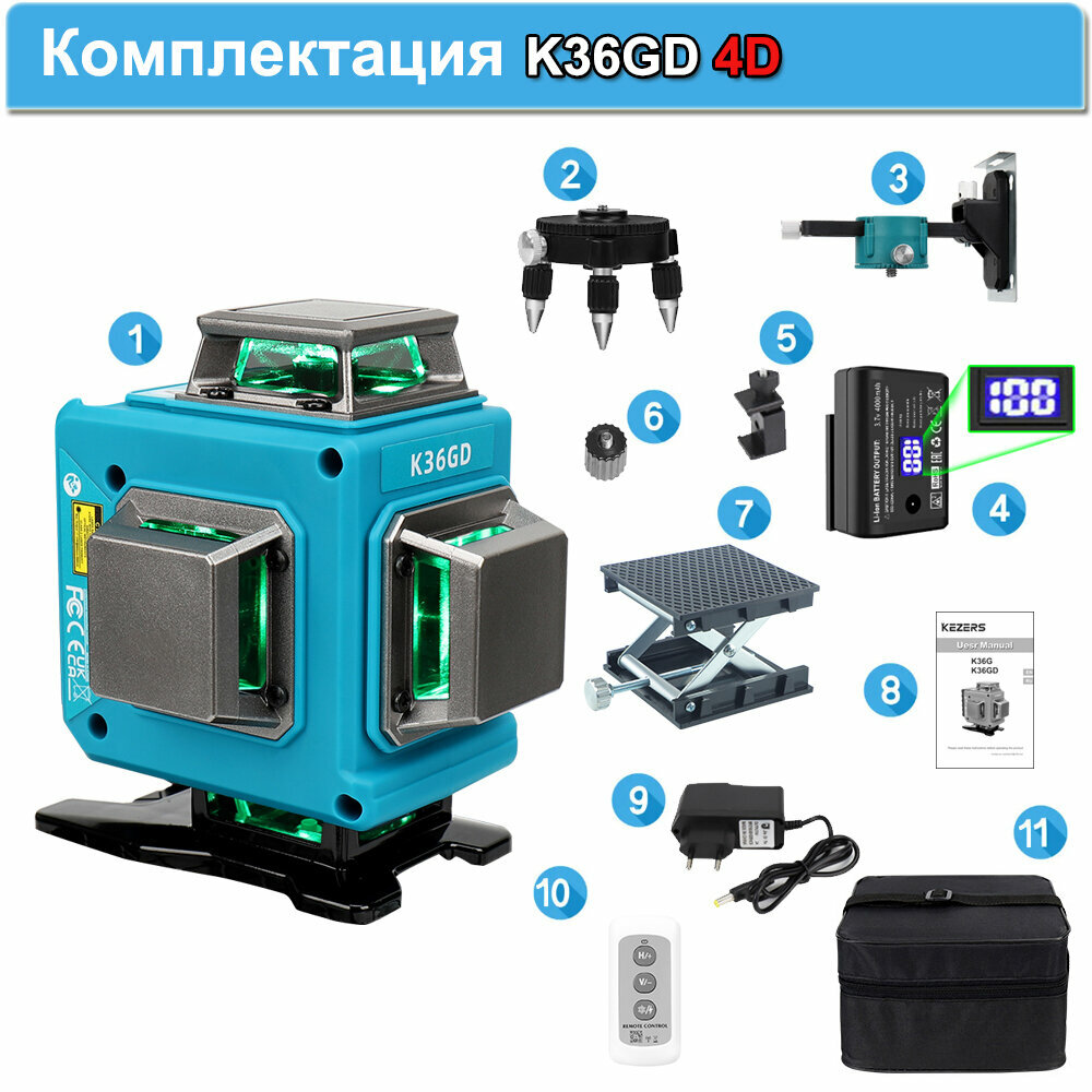 Лазерный уровень/нивелир KEZERS K36GD, Зеленый луч 360 4D 16 Линий информация: