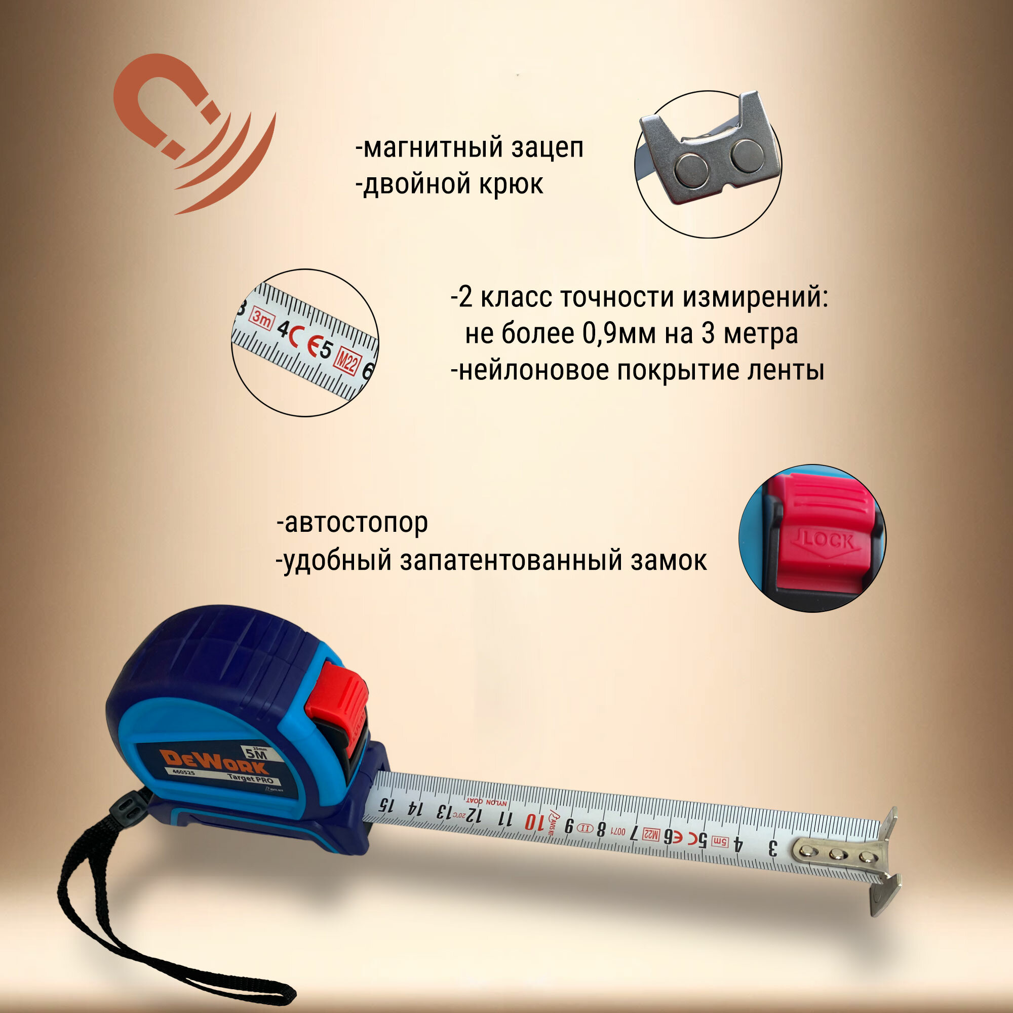 Рулетка строительная DeWork Target PRO 5м x 25мм с автостопом, магнитный зацеп, двухкомпонентная информация: