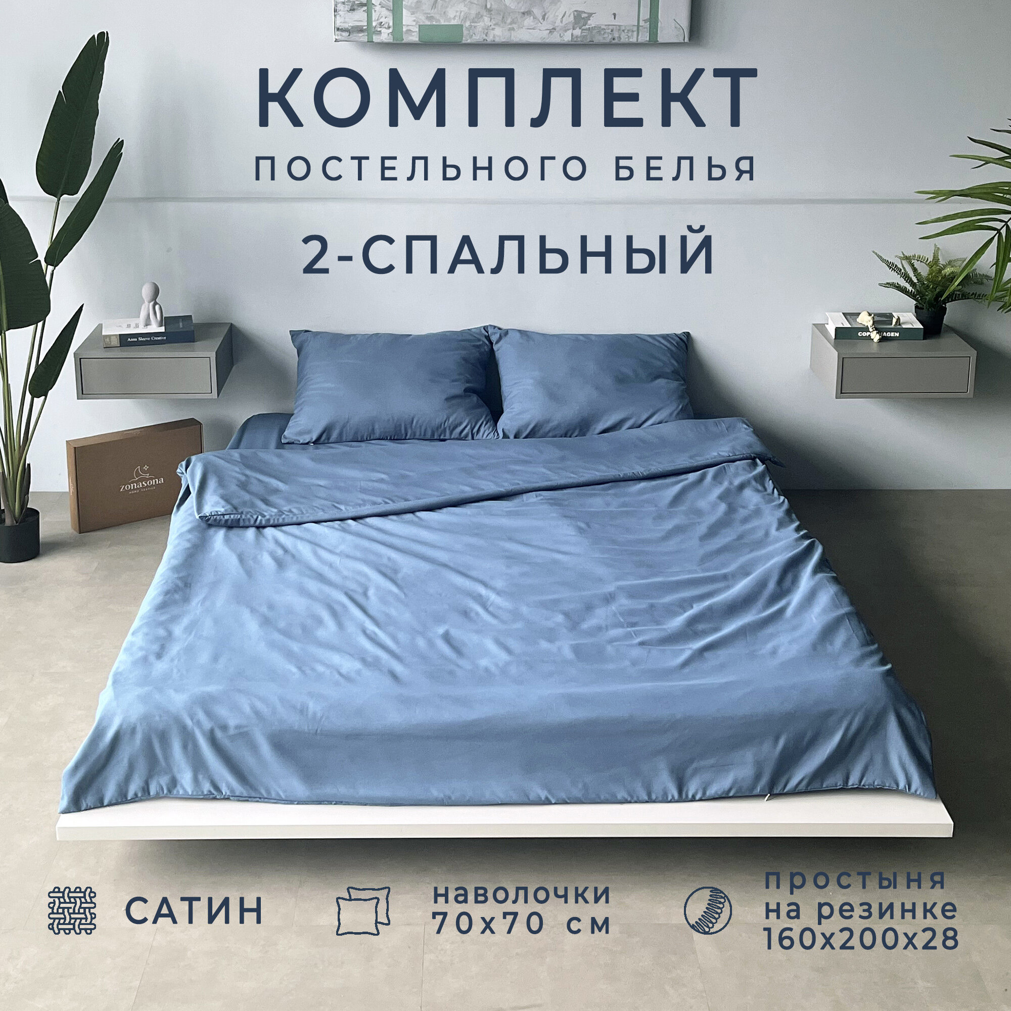 Комплект постельного белья ZonaSona с простыней на резинке, Синий, 2 спальный, сатин, наволочки 70х70 2 шт. информация: