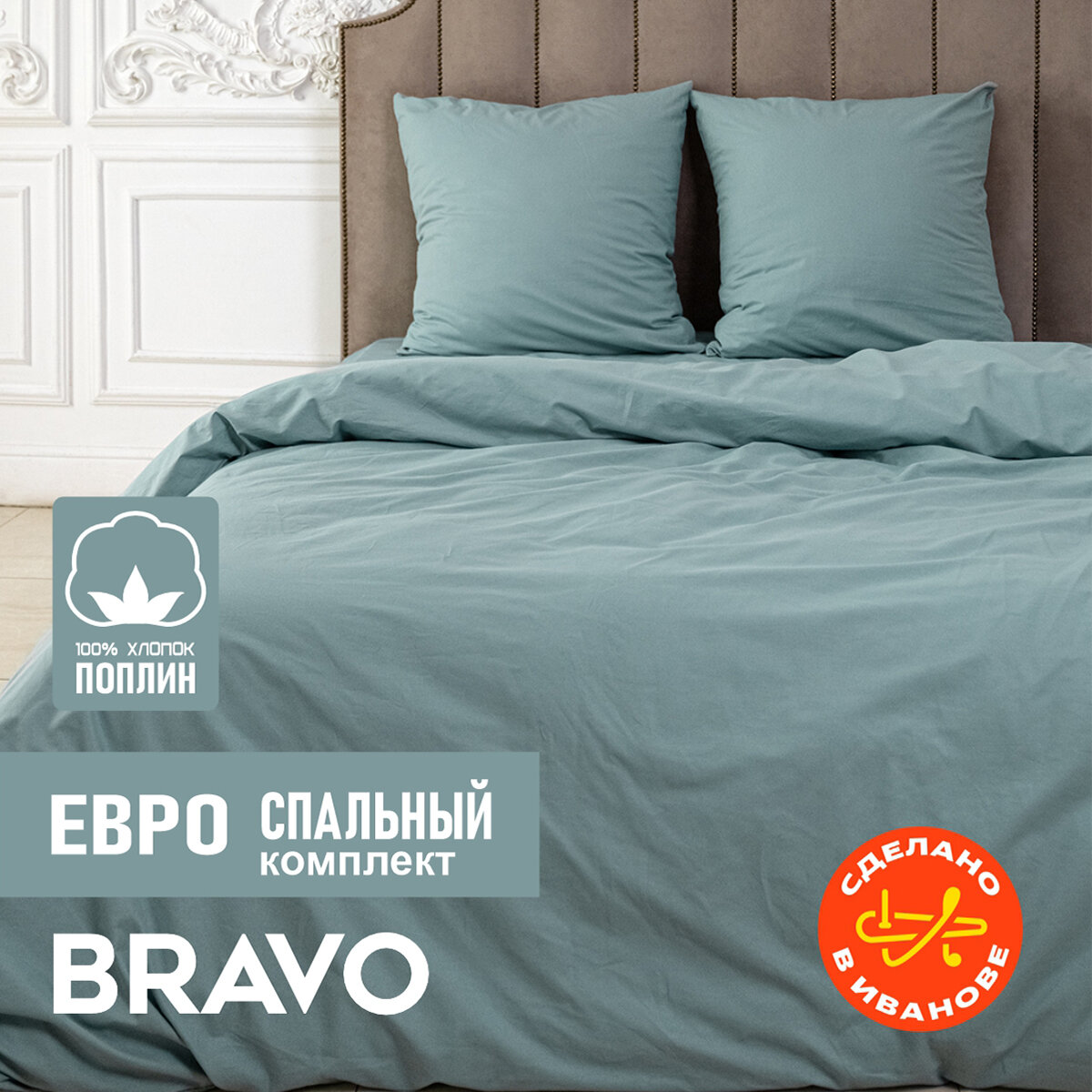 Отзывы на Постельное белье евро BRAVO поплин серо-зеленый/ хлопок / наволочки 70х70
