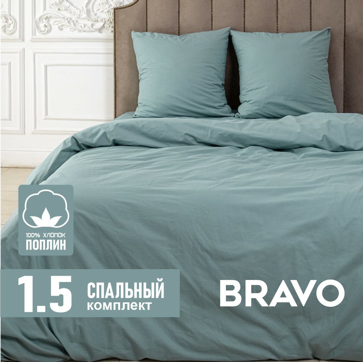 Отзывы на Постельное белье 1,5 спальный размер BRAVO поплин серо-зеленый/ хлопок / наволочки 70х70