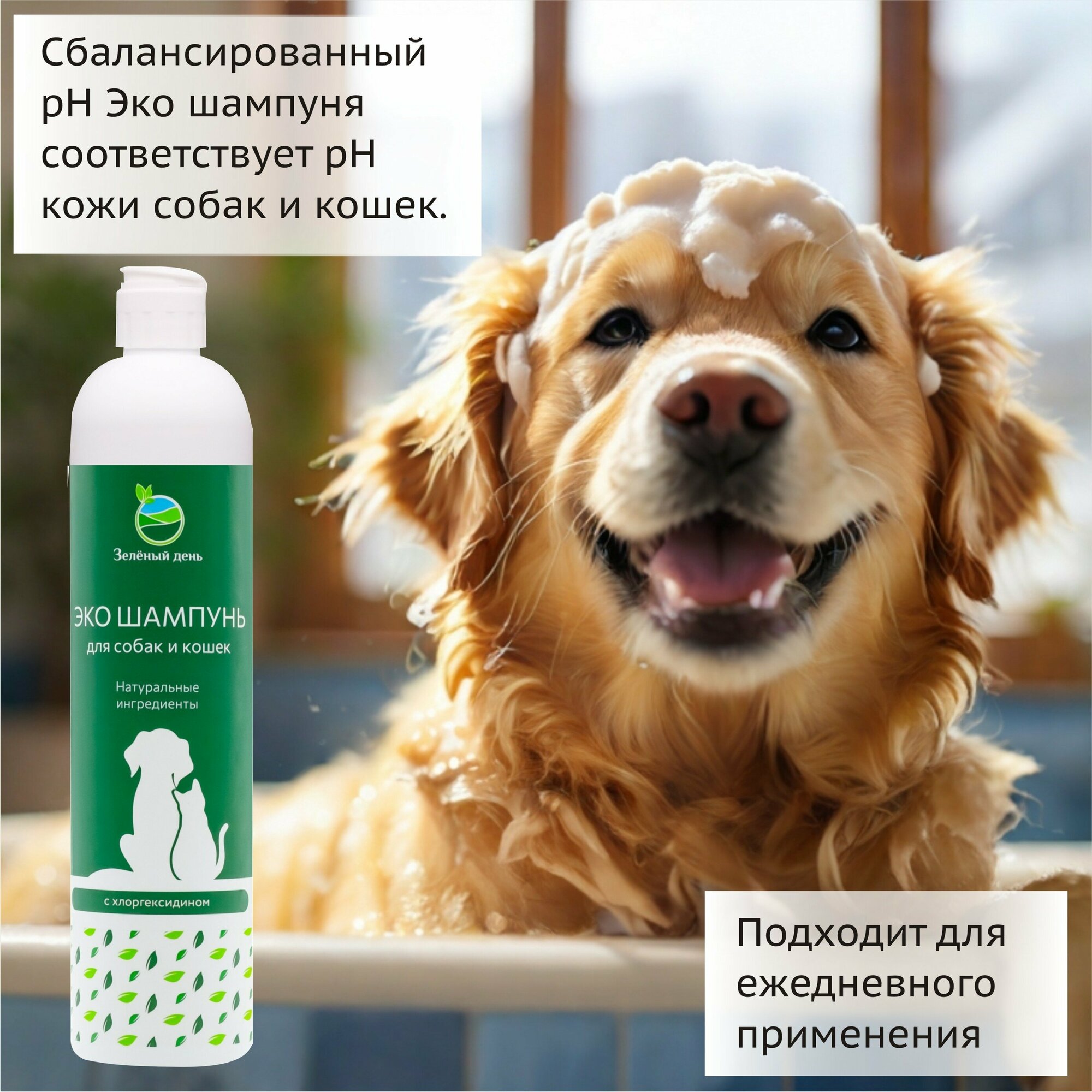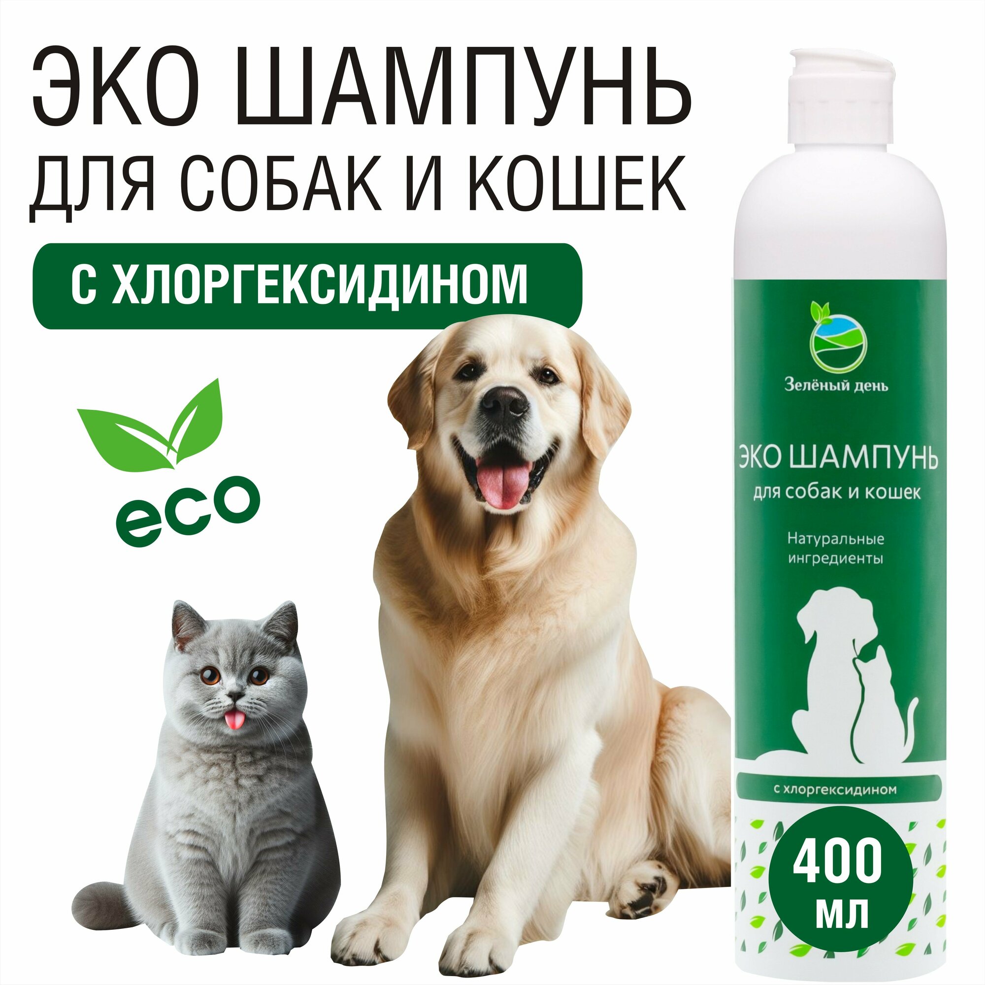 | Подробная комплектация | ЭКО шампунь для собак и кошек антибактериальный с хлоргексидином для больших и малых пород с любым типом и цветом шерсти - 1 флакон 400 мл. |