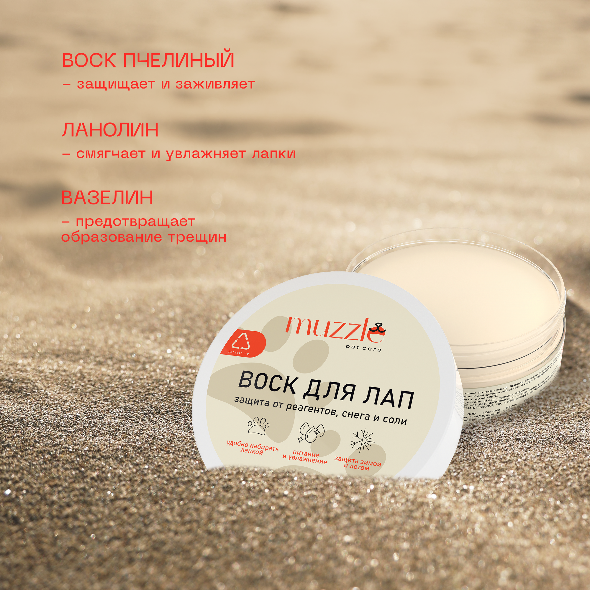 | Дополнительная информация | защищает лапы от морозов и реагентов, смягчает и питает огрубевшую кожу, защищает от летних неблагоприятных воздействий, снижает риск травмирования кожи лап, обладает противовоспалительными свойствами, способствует заживлению и регенерации, короткий натуральный состав, экономичное расходование средства |