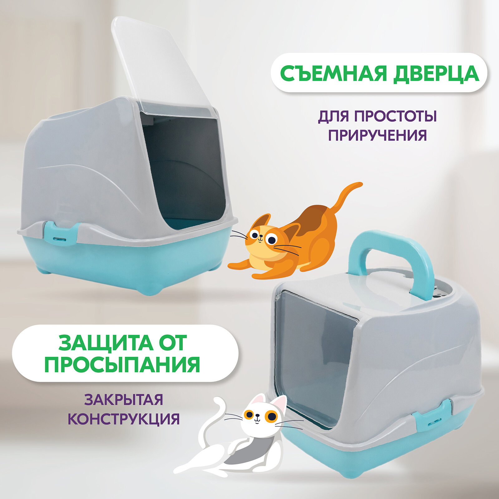 10 цен на Туалет-домик для кошек "PetTails" малый закрытый с дверцей 43*38*h33см (полипропилен) бирюзовый низ/серый верх