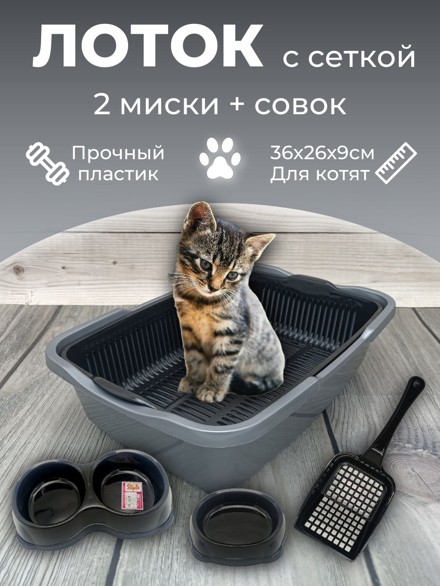 Отзывы на Набор лоток с сеткой с мисками и совком, лоток для котят, туалет для кошек маленький черно- серебристый