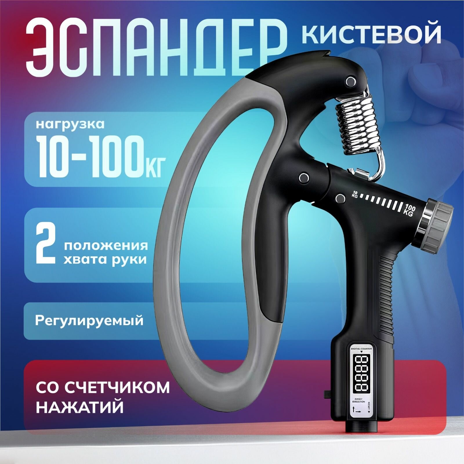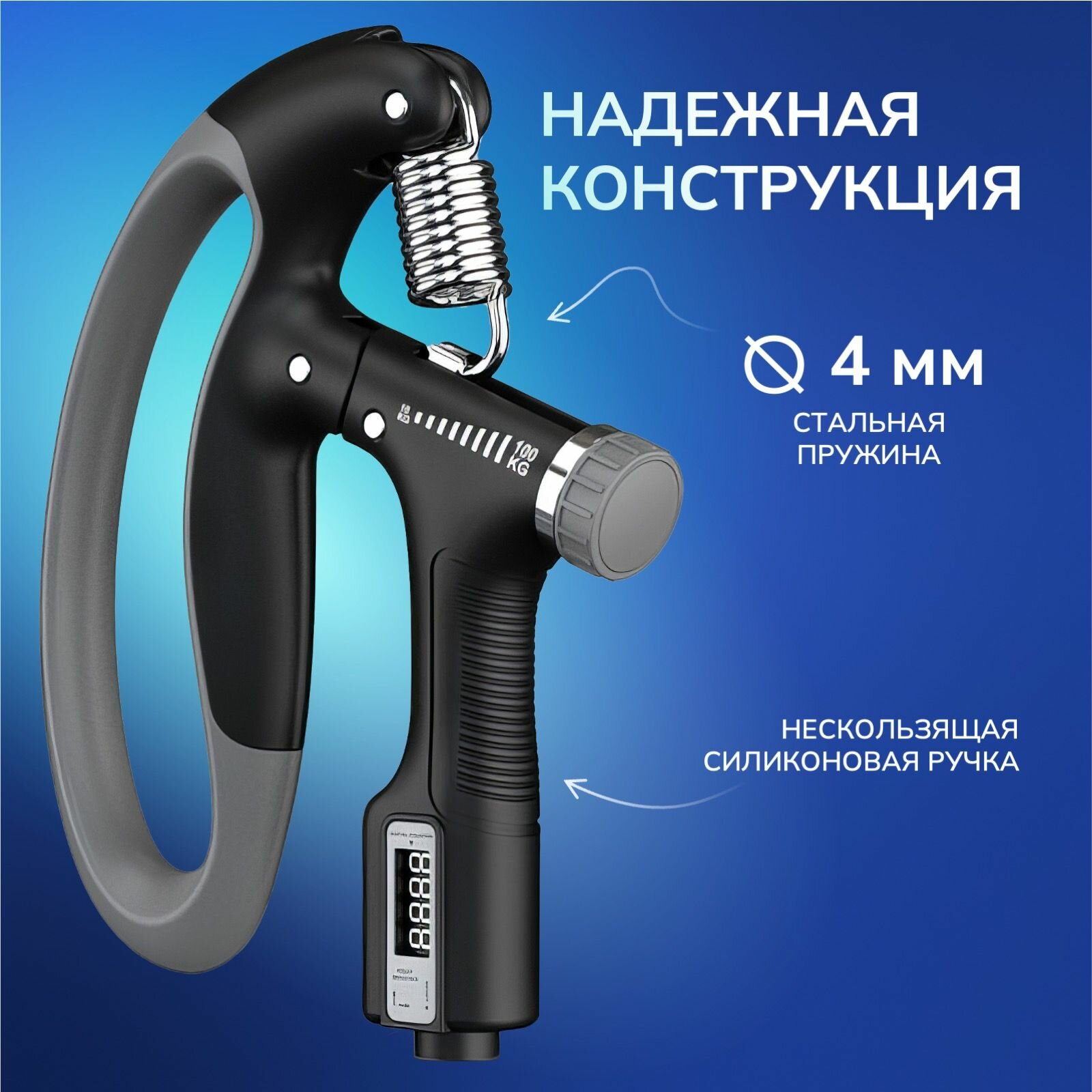 Эспандер кистевой пружинный со счетчиком и регулировкой нагрузки до 100 кг, черный информация: