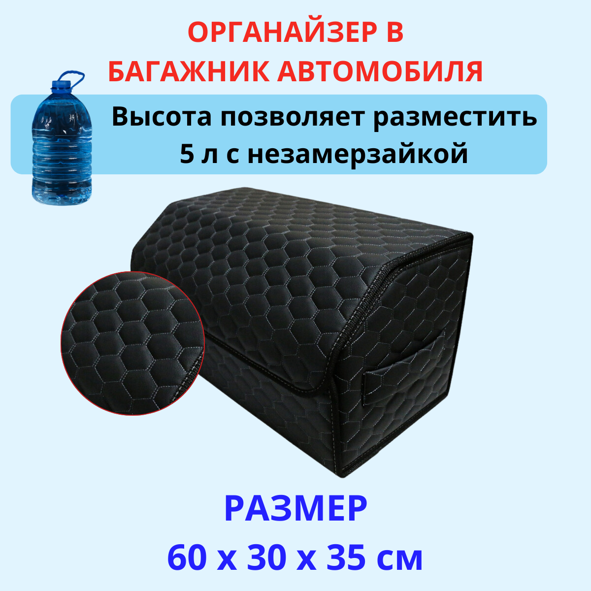 Органайзер в багажник автомобиля 60х30х30 рисунок соты черн/строчка синяя/бокс/кофр для авто