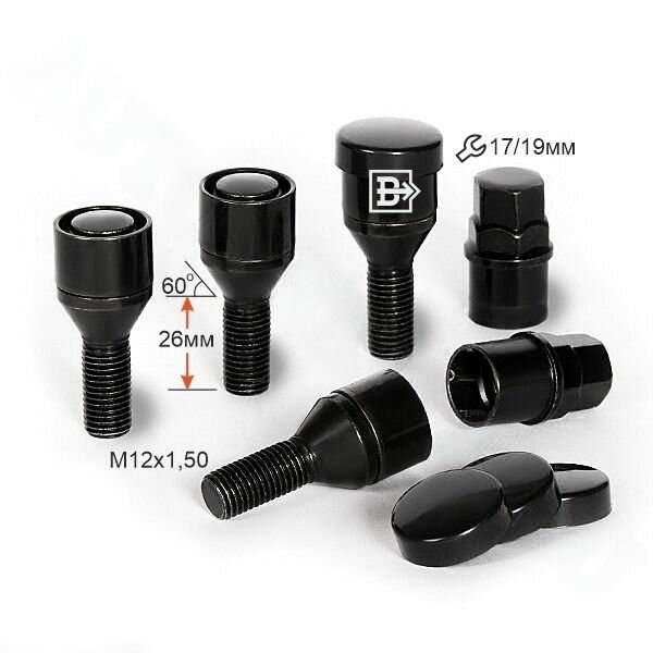 10 цен на Комплект болты секретки M12X1,50 26мм Черный Хром Конус, хром (набор 4 болта+2 ключа)