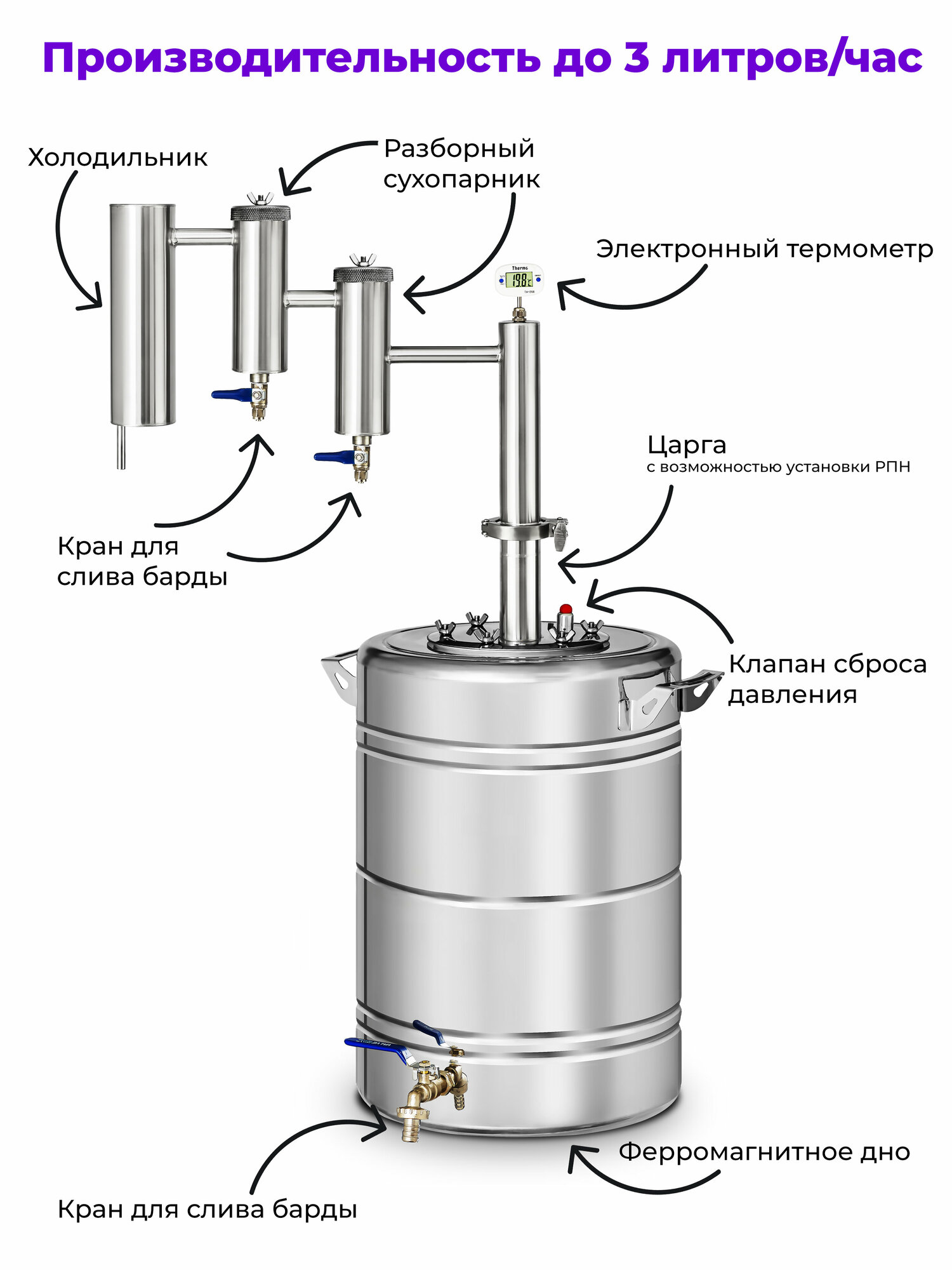 | Дополнительная информация | разборные сухопарники с краником для слива флегмы и возможностью ароматизации |