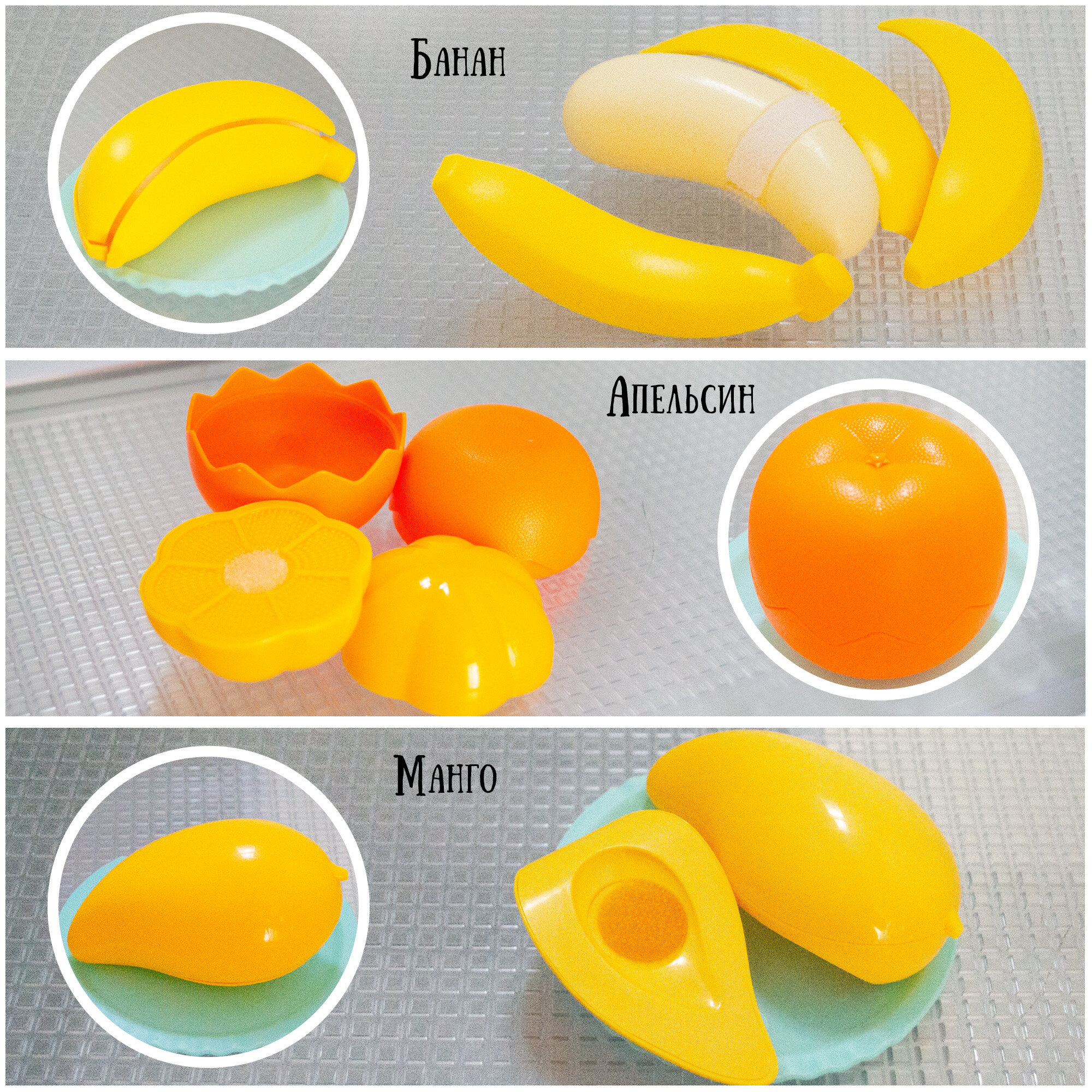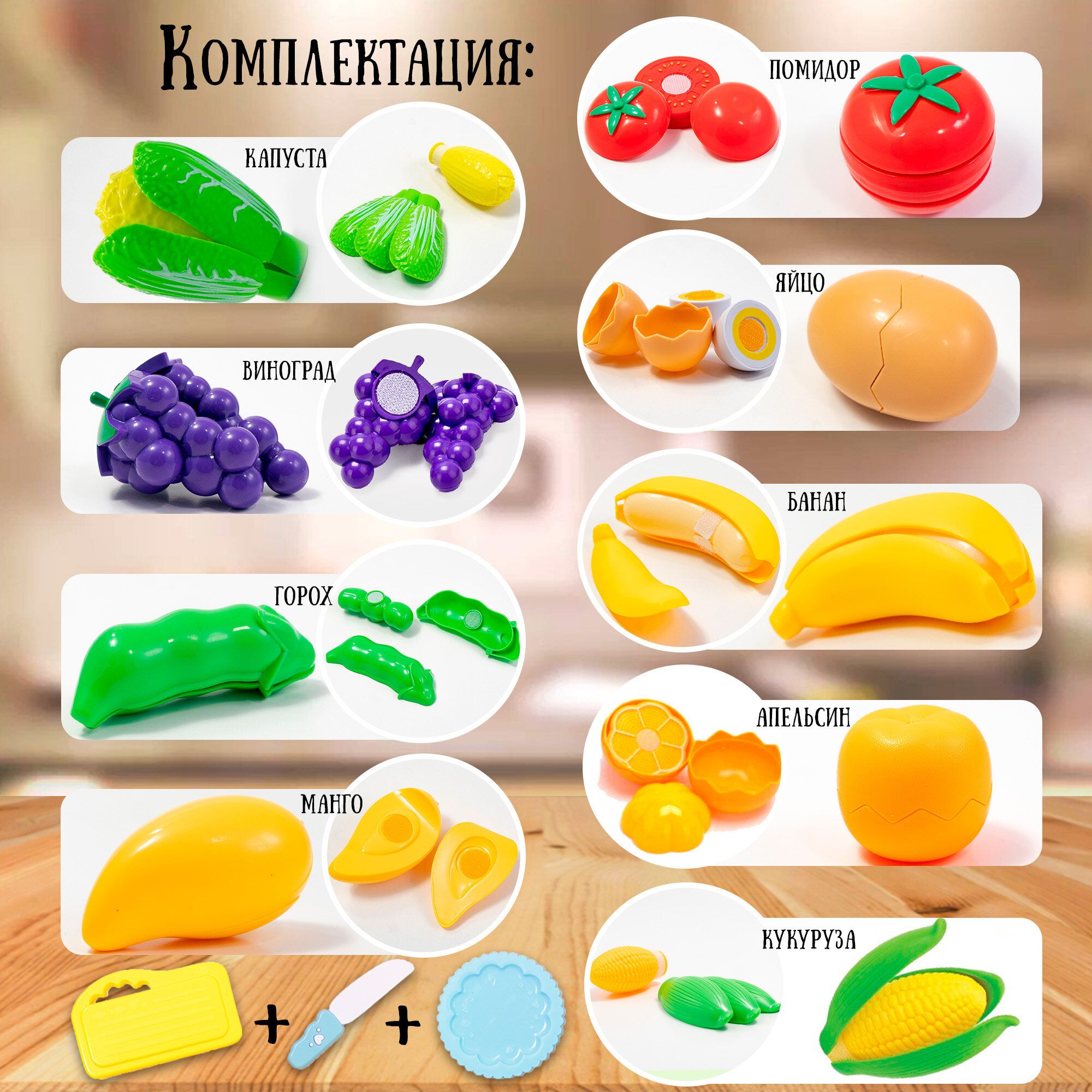 | Комплектация | Рыба 1шт. Мясо 1шт. Яйцо 1шт. Картофель 1шт. Морковь 1шт. Помидор 1шт. Горох 1шт. Пекинская капуста 1шт. Банан 1шт. Апельсин 1шт. Виноград 1шт. Тарелочка 1шт. Разделочная досочка 1шт. Нож 1шт. |