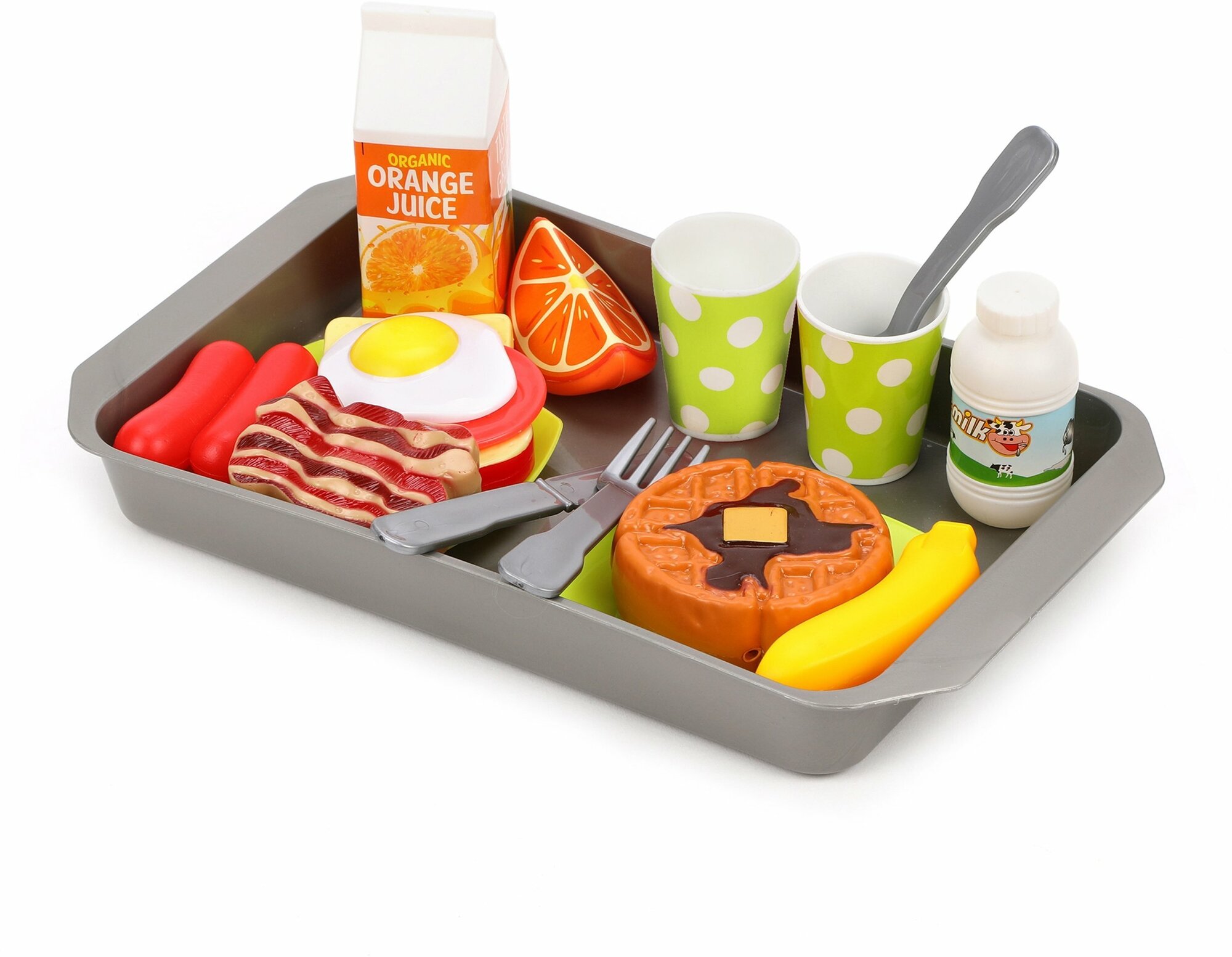 | Комплектация | поднос размером (ДхШхВ) 29х17х3 см, 2 тарелки, 2 стаканчика, 1 яичница, 1бекон, 1 вилка, 1 ножик, 1 ложка, 1 банан, 2 сосиски, 1 ломтик апельсина, 1сок, 1 молоко, 1 панкейк |