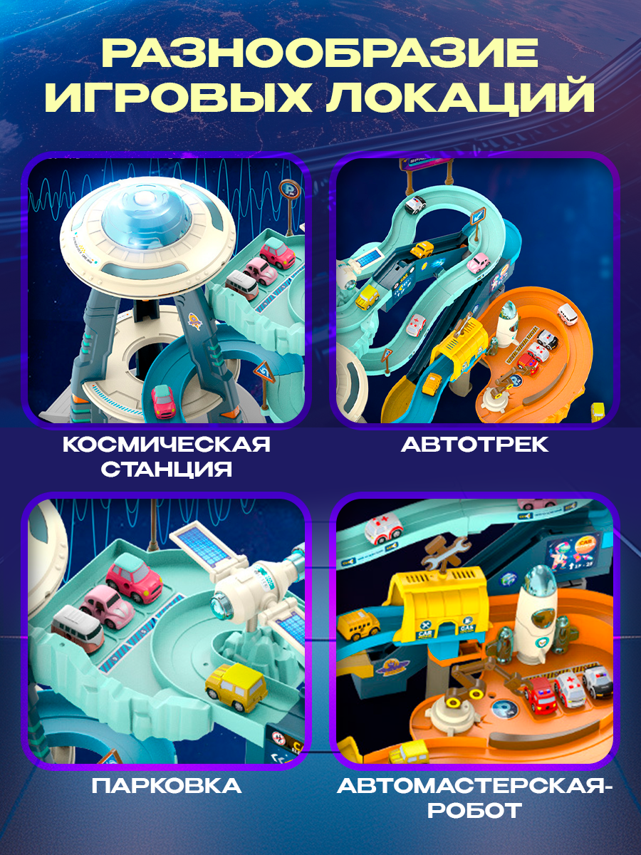 Многоуровневая парковка для машинок WiMi космическая станция, гоночный трек и паркинг, интерактивная ракета и машинки информация: