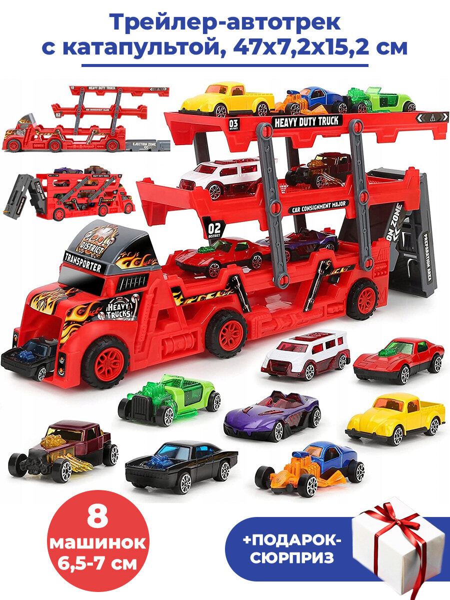 Мини автотрек грузовик трейлер с катапультой красный 8 машинок + Подарок 47х7,2х15,2 см информация: