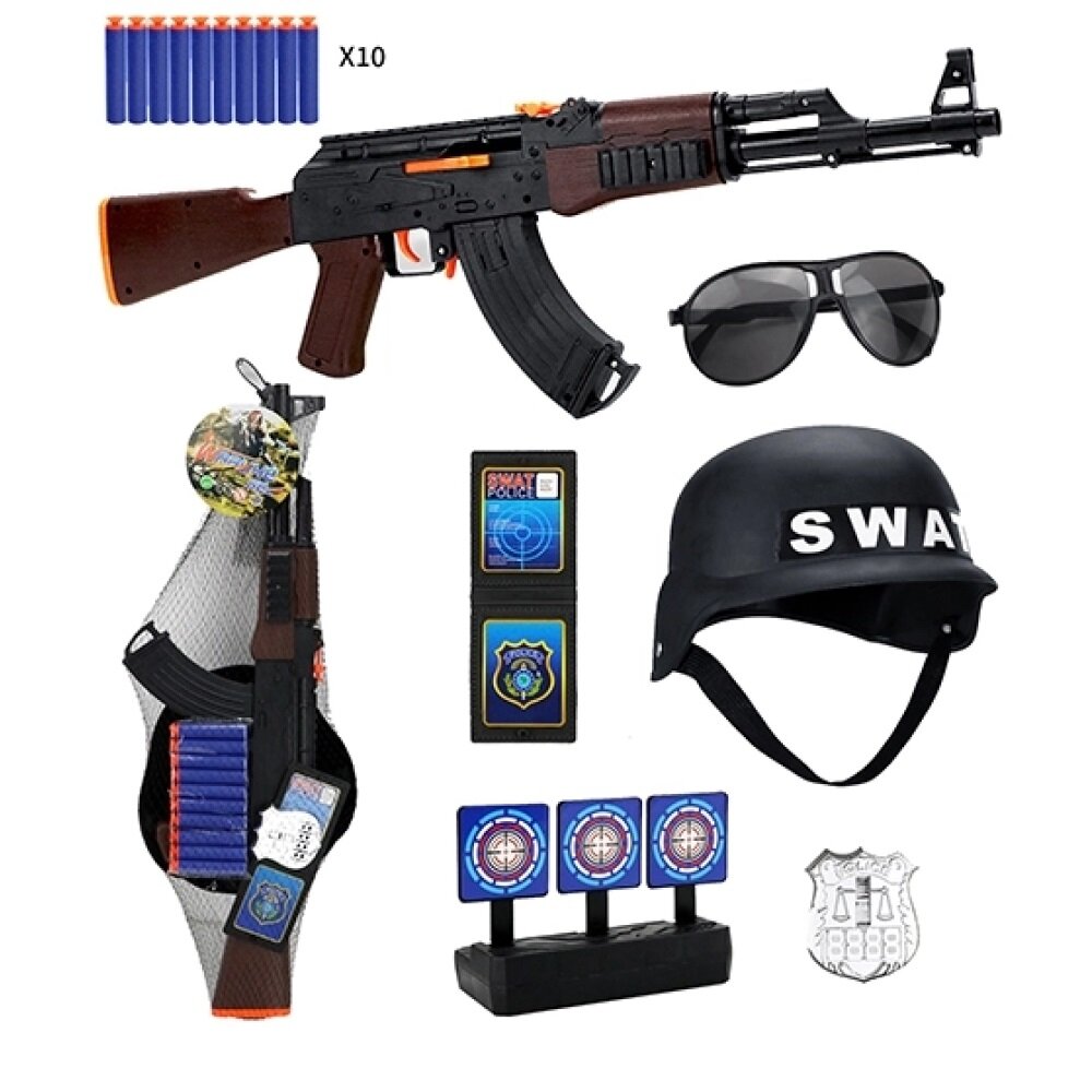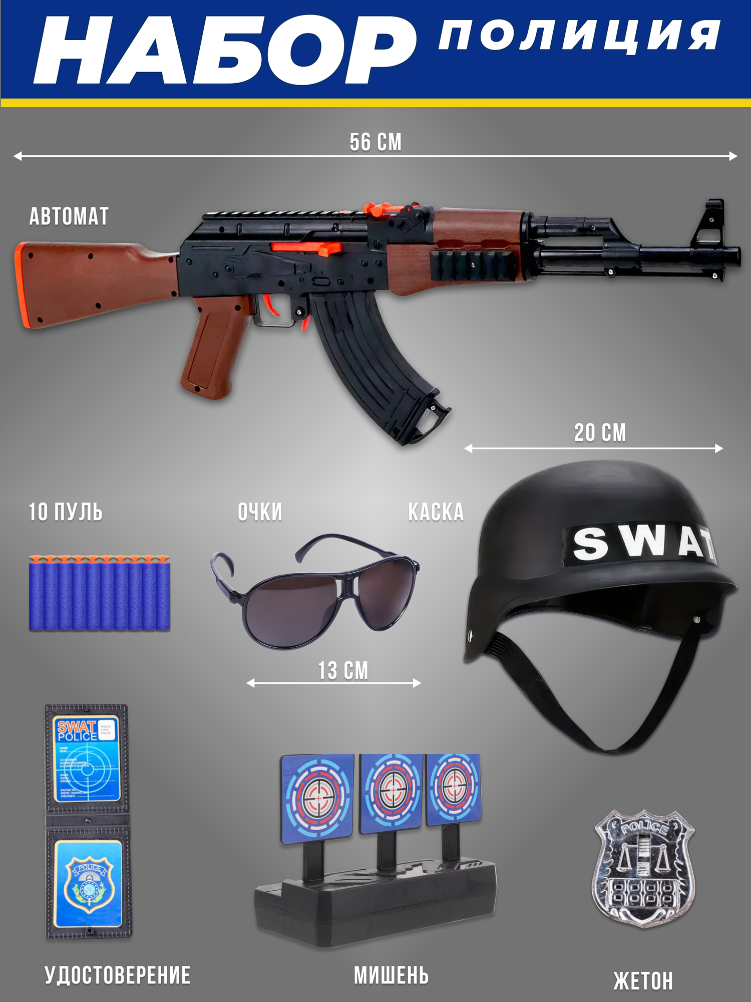Игровой набор полицейского военного, игрушка для мальчика: автомат 56см, каска и очки, значок и удостоверение, патроны 10 штук и мишень информация:
