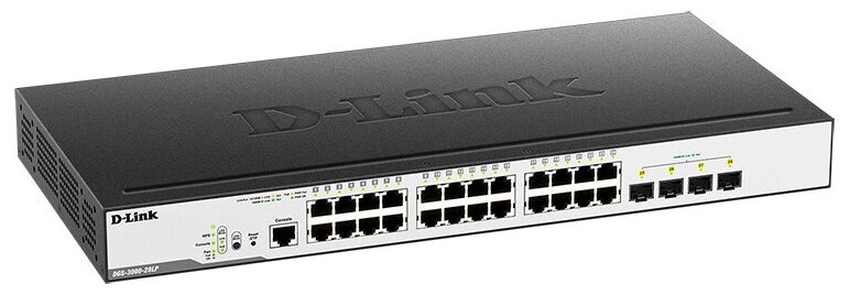 D-Link DGS-3000-28LP/B1A управляемый коммутатор 2 уровня с 24 портами 10/100/1000Base-T и 4 портами 1000Base-X SFP (24 порта с поддержкой PoE 802.3af/802.3at (30 вт), PoE-бюджет 193 вт)