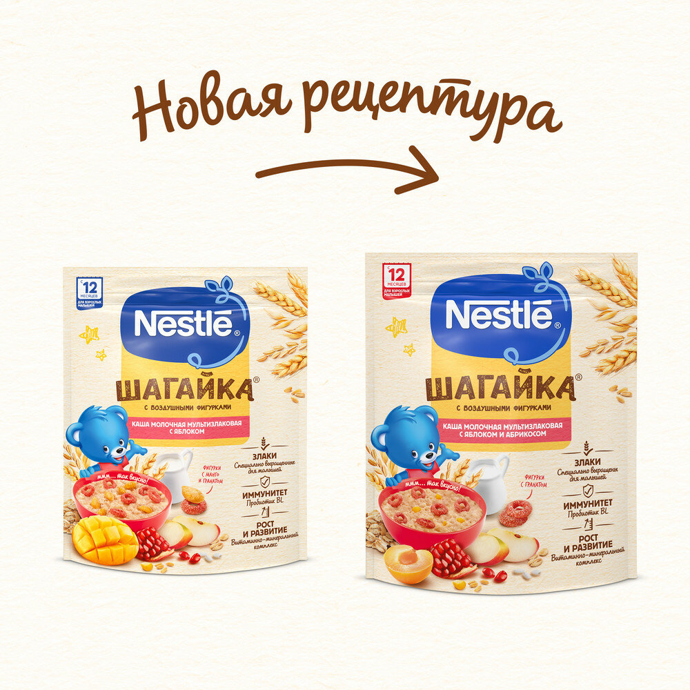 Каша Nestlé молочная Шагайка мультизлаковая с яблоком и пшеничными фигурками с гранатом и манго, с 12 месяцев