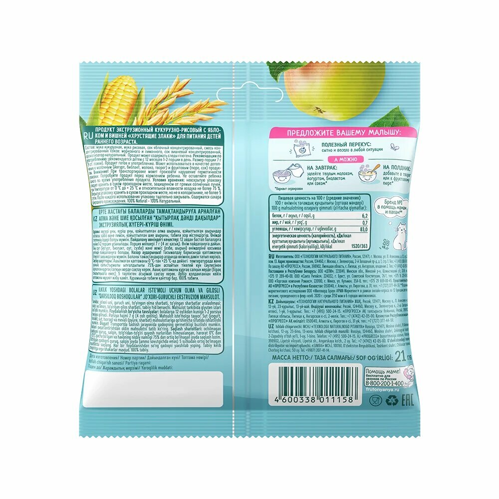 ФрутоПаффсы Кукурузно-рисовые колечки с яблоком и вишней с 12 месяцев 21 г 2 шт информация:
