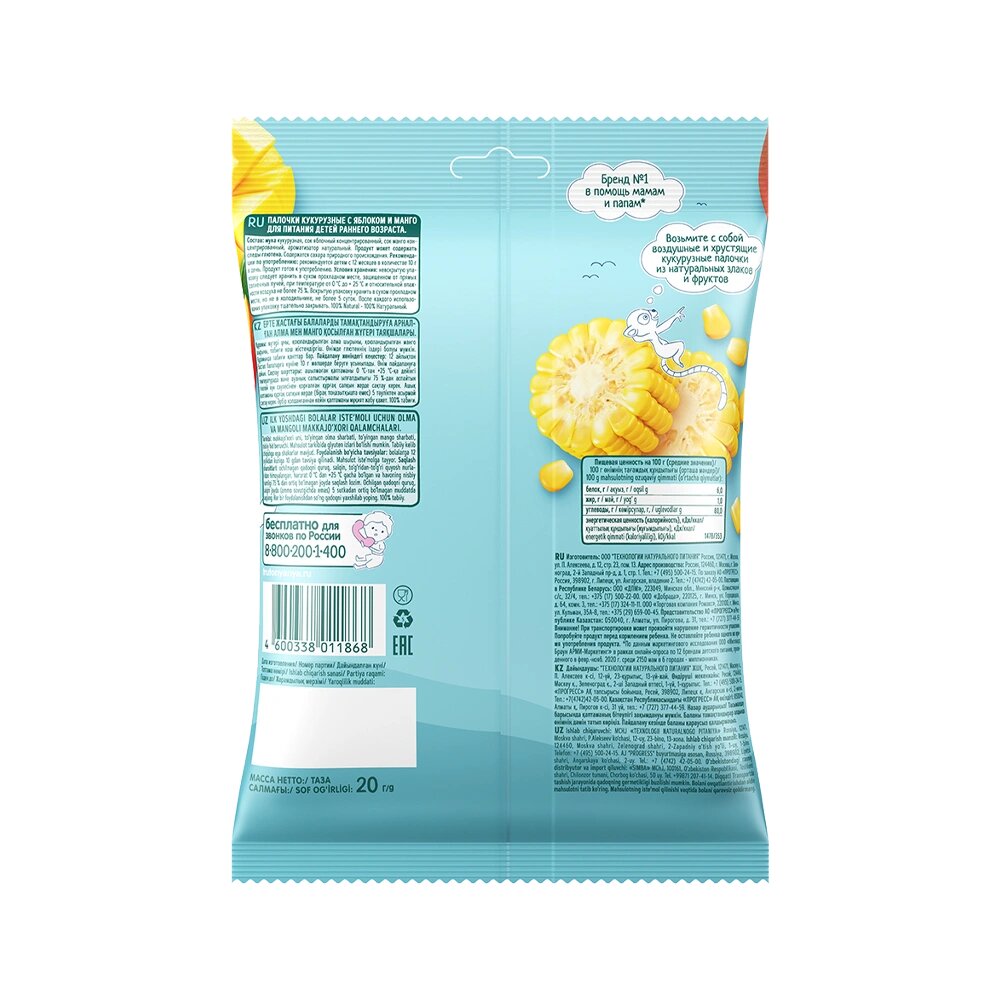 Палочки кукурузные с яблоком и манго "ФрутоНяня" 20г 4 шт информация: