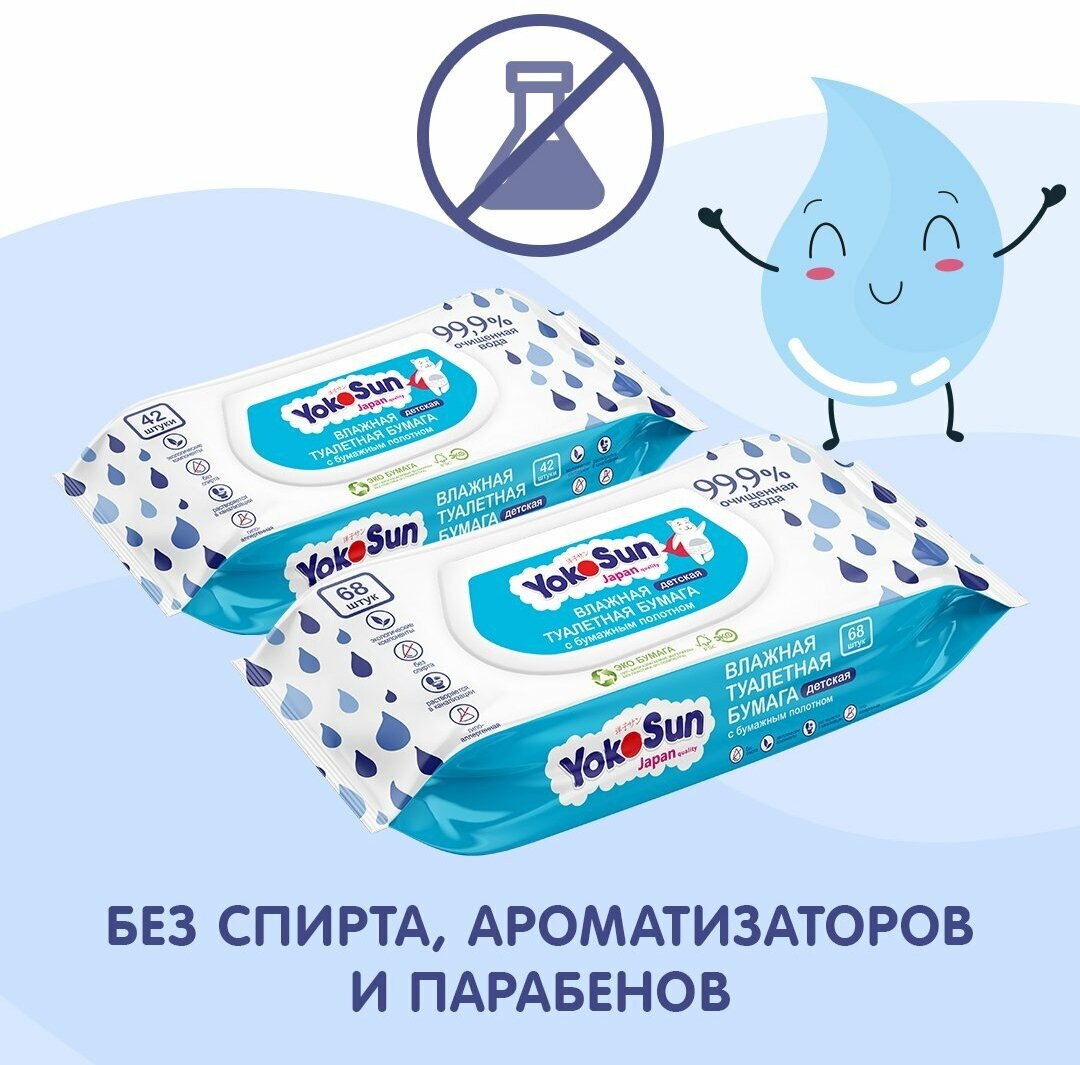Влажная туалетная бумага детская с бумажным полотном YokoSun, пластиковая крышка, 68 шт., 1 уп. информация: