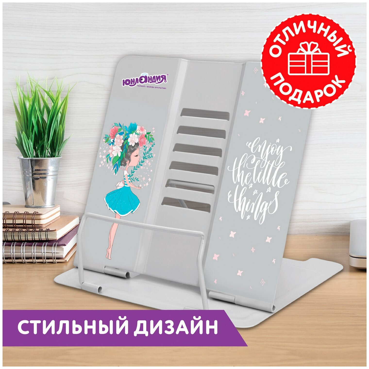 Подставка для книг, учебников, журналов настольная школьная Юнландия Flower girl, регулируемый угол наклона, металл, 237578 информация: