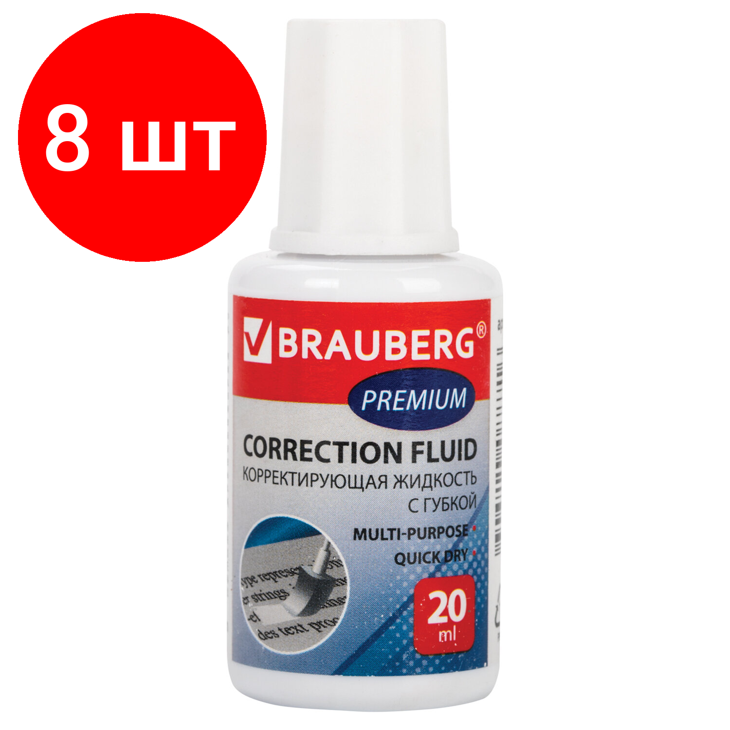 Комплект 8 шт, Корректирующая жидкость BRAUBERG "Premium", быстросохнущая, 20 мл, ярко-БЕЛАЯ, с губкой, 224090 информация: