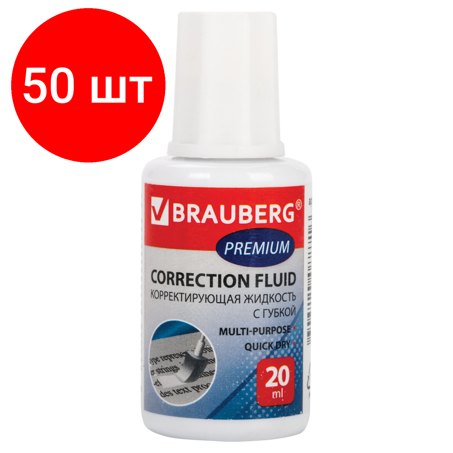 Комплект 50 шт, Корректирующая жидкость BRAUBERG "Premium", быстросохнущая, 20 мл, ярко-БЕЛАЯ, с губкой, 224090 информация: