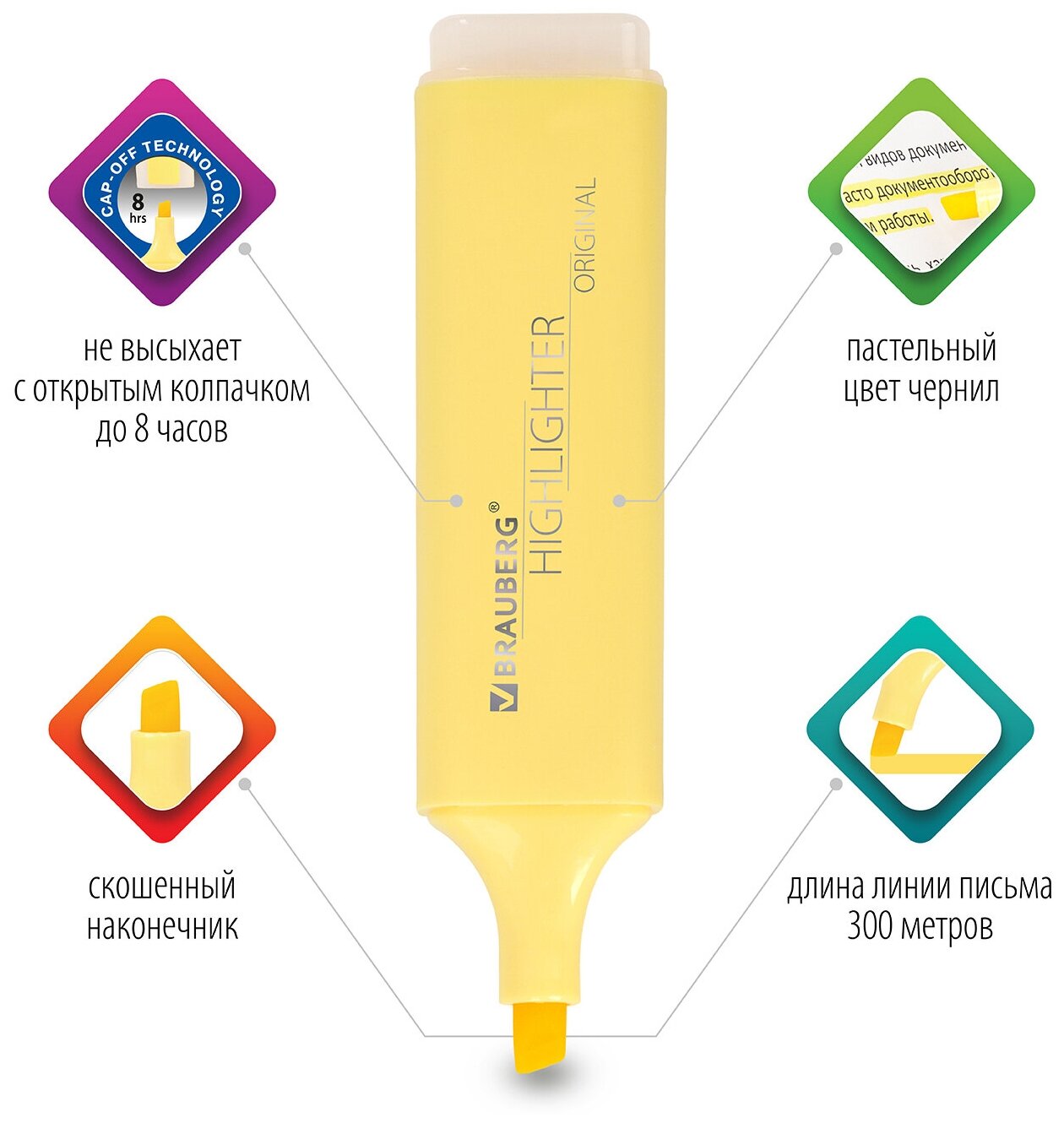 Маркер-текстовыделитель (для выделения текста) Brauberg "Original Pastel", набор из 4 штук, ассорти цветов, линия 1-5 мм информация: