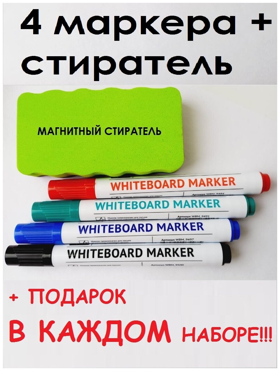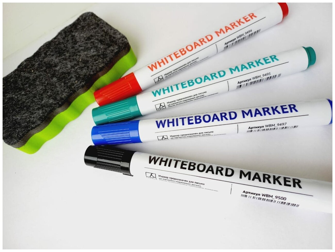 | Дополнительная информация | Набор состоит из маркеров 4 цветов (черный, синий, красный, зеленый) и магнитной губки-стирателя. Кроме этого, в каждом наборе вы найдете подарок!!! Маркеры пишут ярко и сочно. Имеют быстросохнующие чернила, легко стираемые губкой, которая идет в комплекте.Губка-стиратель имеет внутренний магнит для удобства хранения непосредственно на доске. Маркеры предназначены для письма на магнитно-маркерных досках. Имеют закругленный пишущий узел. Толщина линии 2,5 мм. Чернила на спиртовой основе быстро сохнут и легко стираются сухой губкой для досок. Маркеры хранить с закрытым колпачком. Маркеры используются в каждом офисе, детском саду, школе, мед.центрах, на производстве и во многих других учреждениях. |