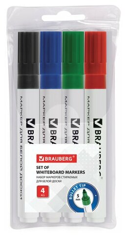 Маркеры/фломастеры для магнитной доски стирающиеся Brauberg, набор из 4 шт., 5 мм, классические, ассорти, круглый наконечник